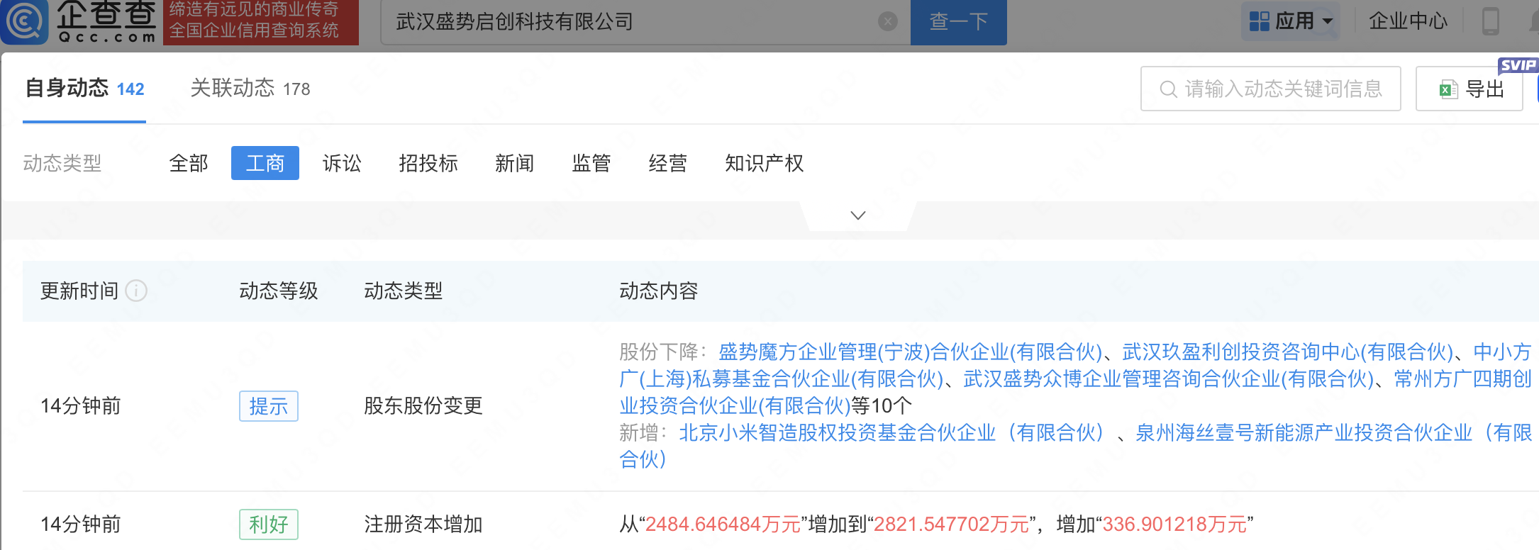 企查查APP显示,近日,武汉盛势启创科技有限公司发生工商变更,新增北京小米智造股权投资基金合伙企业(有限合伙)等为股东,同时注册资本增至2821.55万元。企查查信息显示,该公司成立于2020年,法定代表人为李成,经营范围包含:汽车零部件研发;汽车零部件及配件制造;汽车零配件批发;汽车零配件零售等。公开信息显示,盛势启创是一家汽车动力总成系统传感器研发商,专注于提供汽车动力总成系统传感器、智能执行器、智能座舱解决方案,集研发、生产、销售、服务于一体的汽车零部件科技公司。