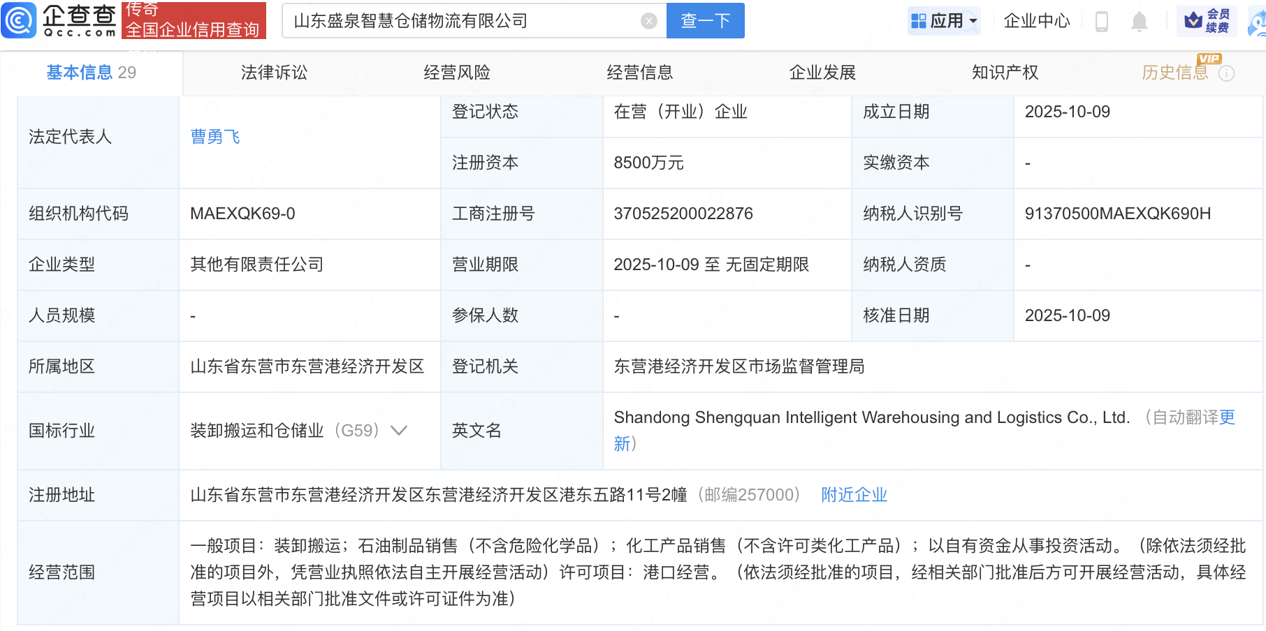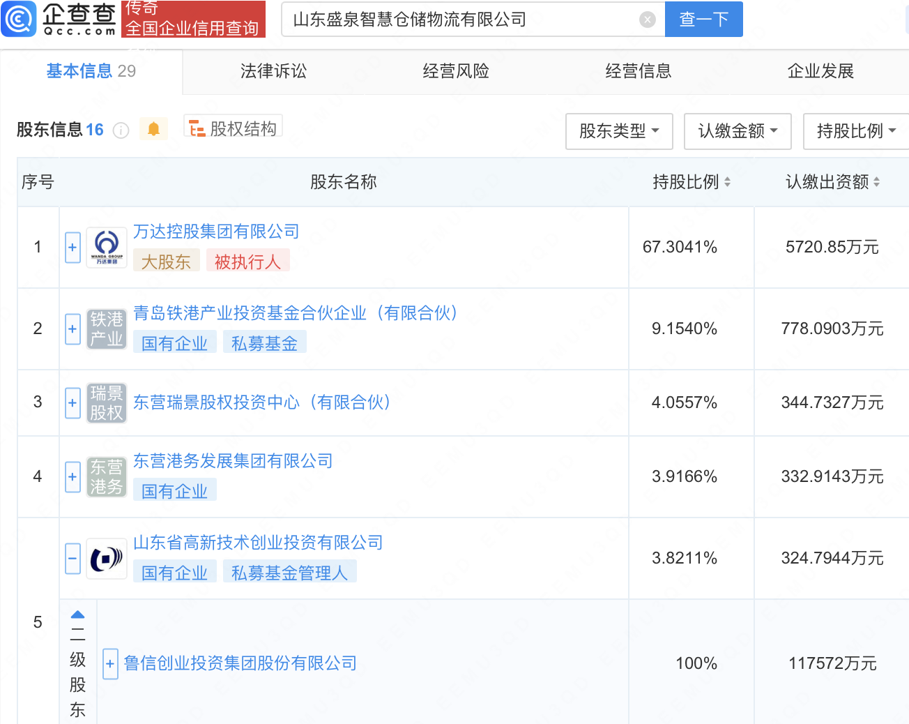 企查查APP显示,近日,山东盛泉智慧仓储物流有限公司成立,注册资本8500万元,经营范围包含:装卸搬运;石油制品销售(不含危险化学品);化工产品销售(不含许可类化工产品);以自有资金从事投资活动等。企查查股权穿透显示,该公司由万达控股集团有限公司、鲁信创投(600783)全资子公司山东省高新技术创业投资有限公司等共同持股。