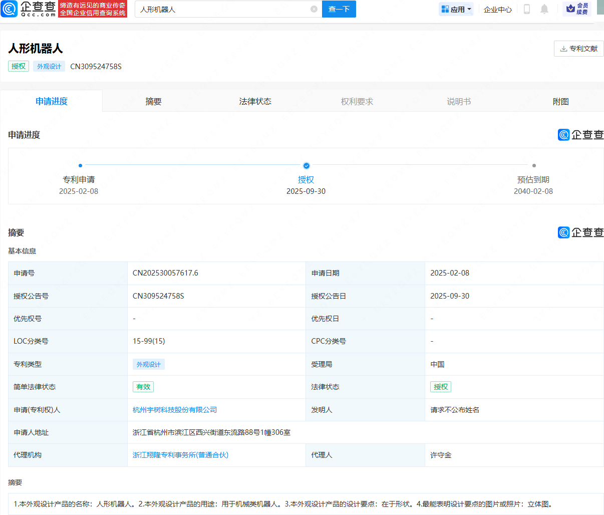 企查查APP显示,近日,杭州宇树科技股份有限公司申请的人形机器人专利获授权。专利摘要显示,本外观设计产品用途为用于机械类机器人,设计要点在于形状。据了解,该款人形机器人因身着花棉袄,在今年央视春晚表演扭秧歌引发国内外热议。