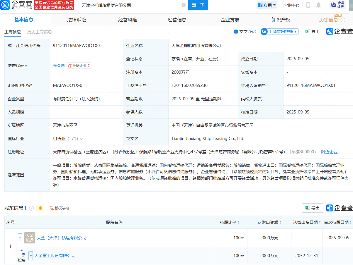 企查查APP显示,近日,天津金祥船舶租赁有限公司、天津金泰船舶租赁有限公司成立,法定代表人均为张令明,注册资本均为2000万元,经营范围均包含:船舶租赁;从事国际集装箱船、普通货船运输;国内货物运输代理;船舶销售;货物进出口等。企查查股权穿透显示,两公司均由大金重工(002487)间接全资持股。