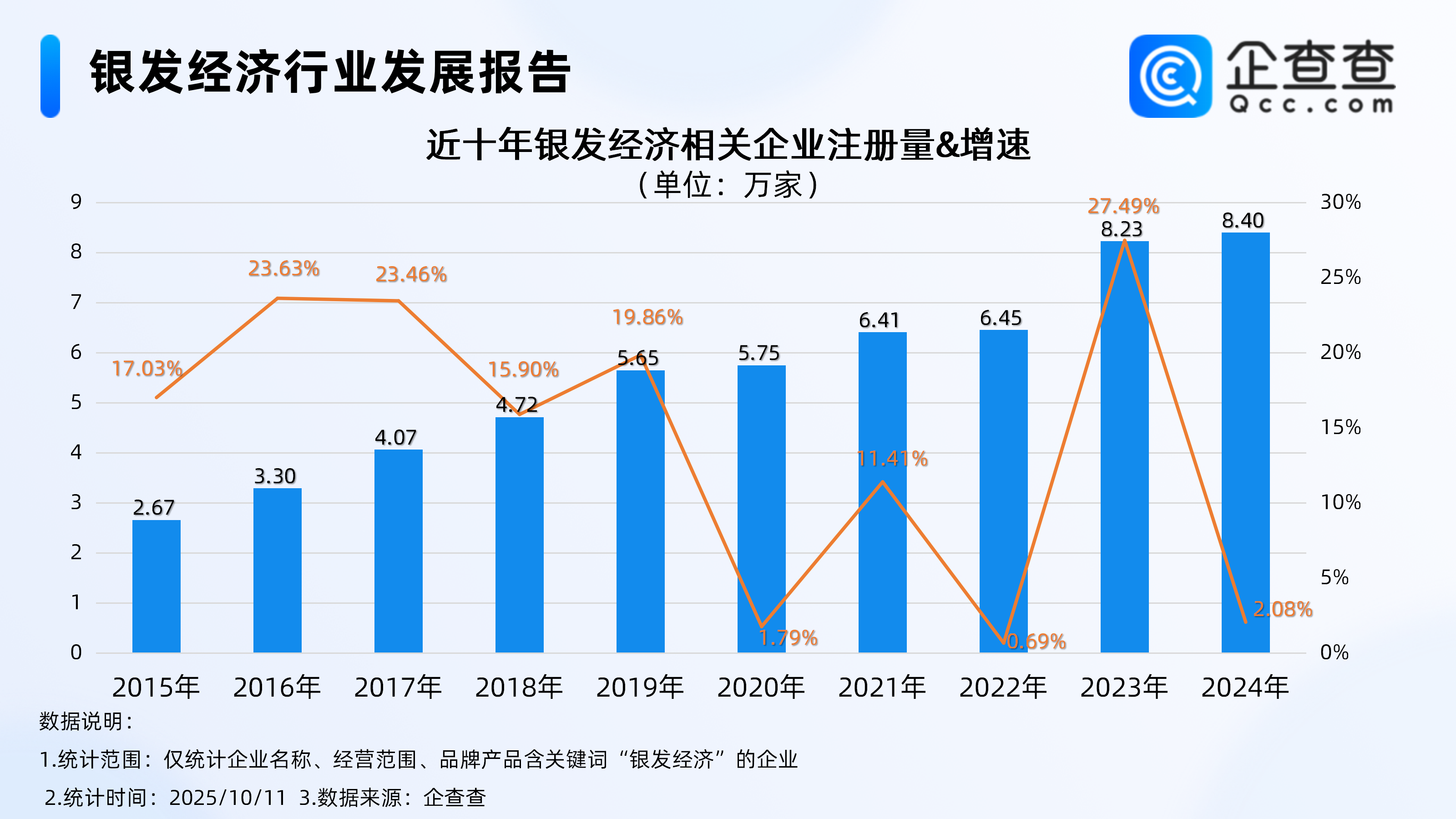 企查查数据显示,注册量方面,近十年银发经济相关企业年注册量呈逐年上升趋势,2024年注册量达8.4万家,同比增长2.08%。截至目前,今年已注册6.6万家相关企业,其中前9月注册量达6.55万家,同比增长6.63%。