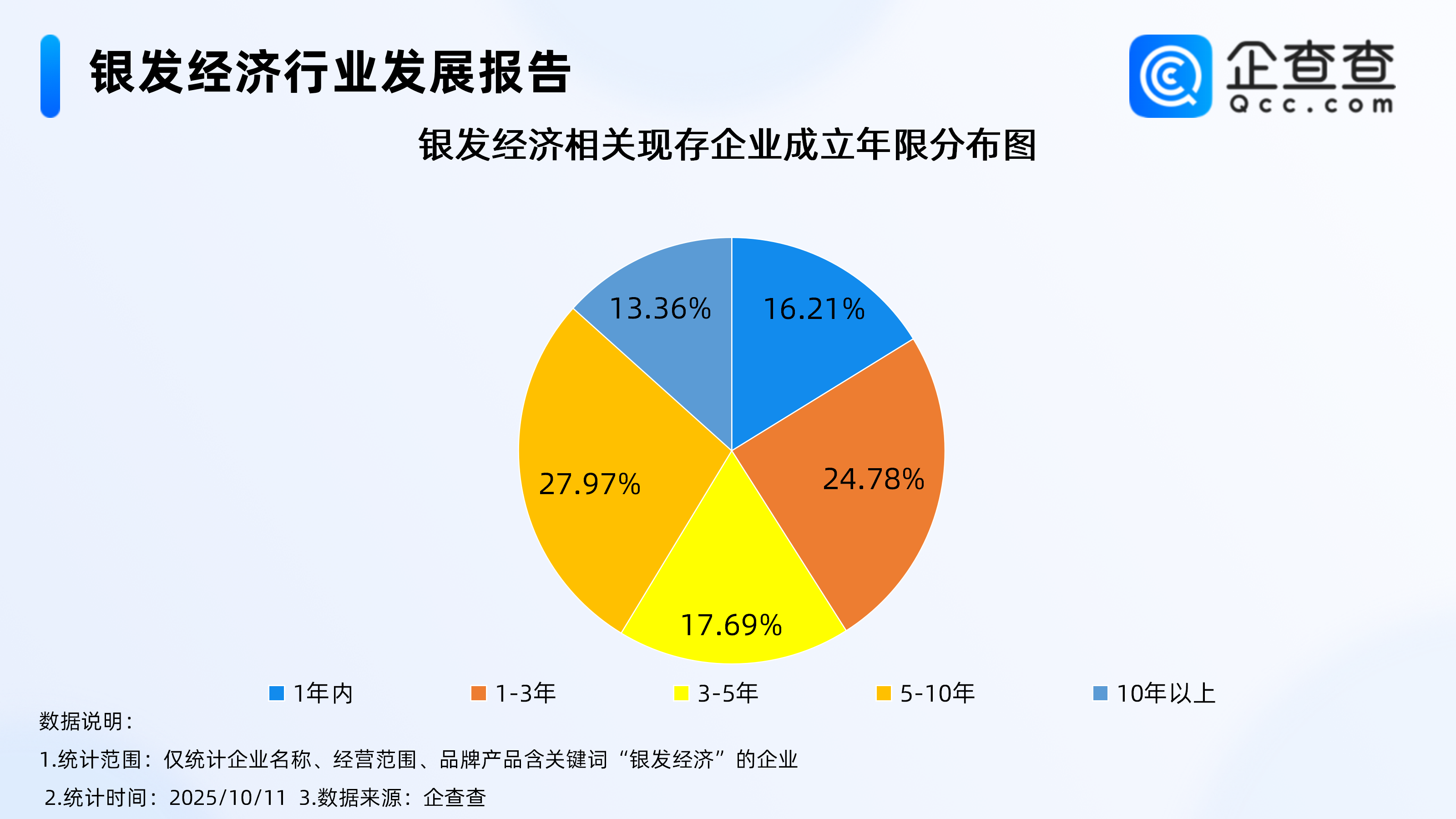 企查查数据显示,从成立年限来看,国内银发经济相关现存企业中,成立年限在5-10年的相关企业最多,占比达27.97%,其次为成立年限在1-3年的企业,占比达24.78%。