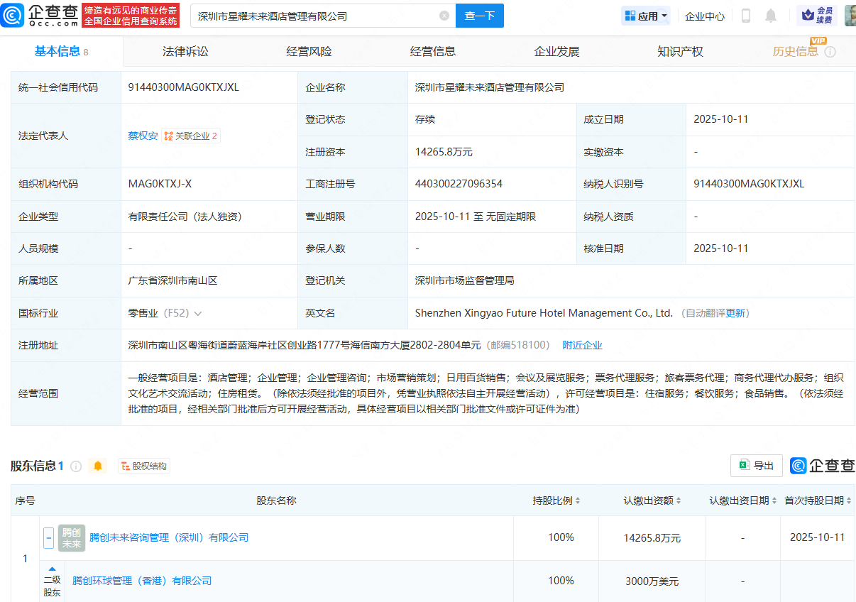 企查查APP显示,深圳市星耀未来酒店管理有限公司成立,法定代表人为蔡权安,注册资本为1.43亿元,经营范围包含:酒店管理;企业管理;企业管理咨询;市场营销策划;日用百货销售;会议及展览服务等。企查查股权穿透显示,该公司由腾讯关联公司腾创未来咨询管理(深圳)有限公司全资持股。
