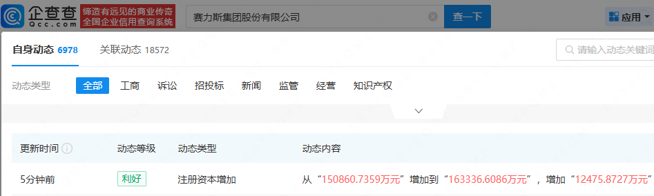 企查查APP显示,近日,赛力斯(601127)发生工商变更,注册资本由约15.09亿元增至约16.33亿元,增幅约8%。企查查显示,赛力斯成立于2007年5月,法定代表人为张正萍,由重庆小康控股有限公司、东风汽车集团有限公司等共同持股。