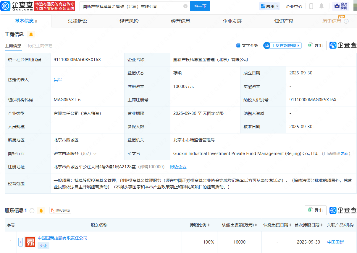 企查查APP显示,近日,国新产投私募基金管理(北京)有限公司成立,法定代表人为吴军,注册资本为1亿元,经营范围包含:私募股权投资基金管理、创业投资基金管理服务。企查查股权穿透显示,该公司由中国国新控股有限责任公司全资持股。