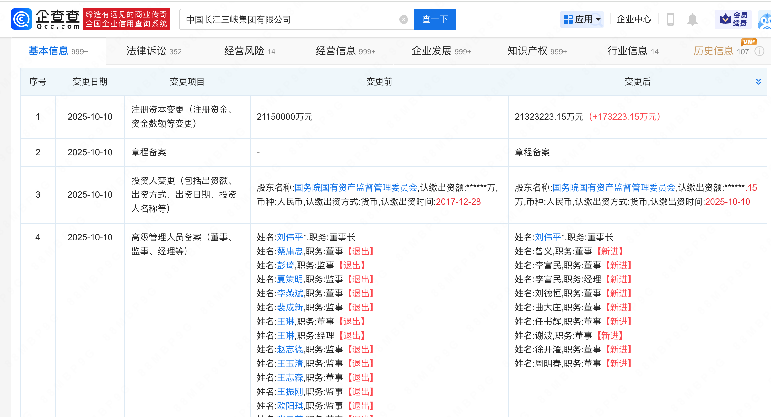 企查查APP显示,近日,中国长江三峡集团有限公司发生工商变更,注册资本由2115亿人民币增至约2132.3亿人民币,同时,多位高管均发生变更。企查查信息显示,该公司成立于1993年9月,法定代表人为刘伟平,经营范围含项目投资、股权投资、水力发电等,由国务院国有资产监督管理委员会全资持股。