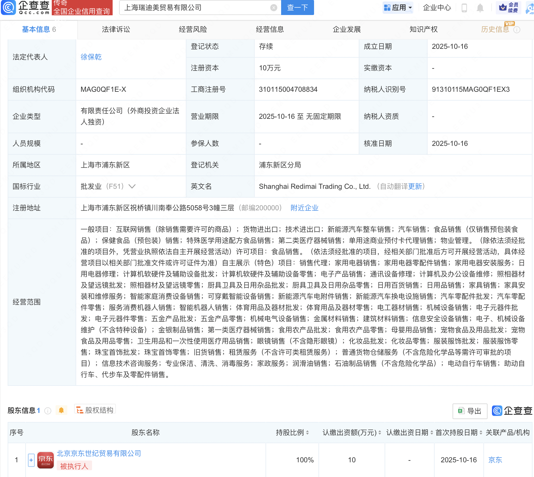 企查查APP显示,近日,上海瑞迪美贸易有限公司成立,经营范围包含:新能源汽车整车销售;汽车销售;服务消费机器人销售;智能机器人销售等。企查查股权穿透显示,该公司由北京京东世纪贸易有限公司全资持股。