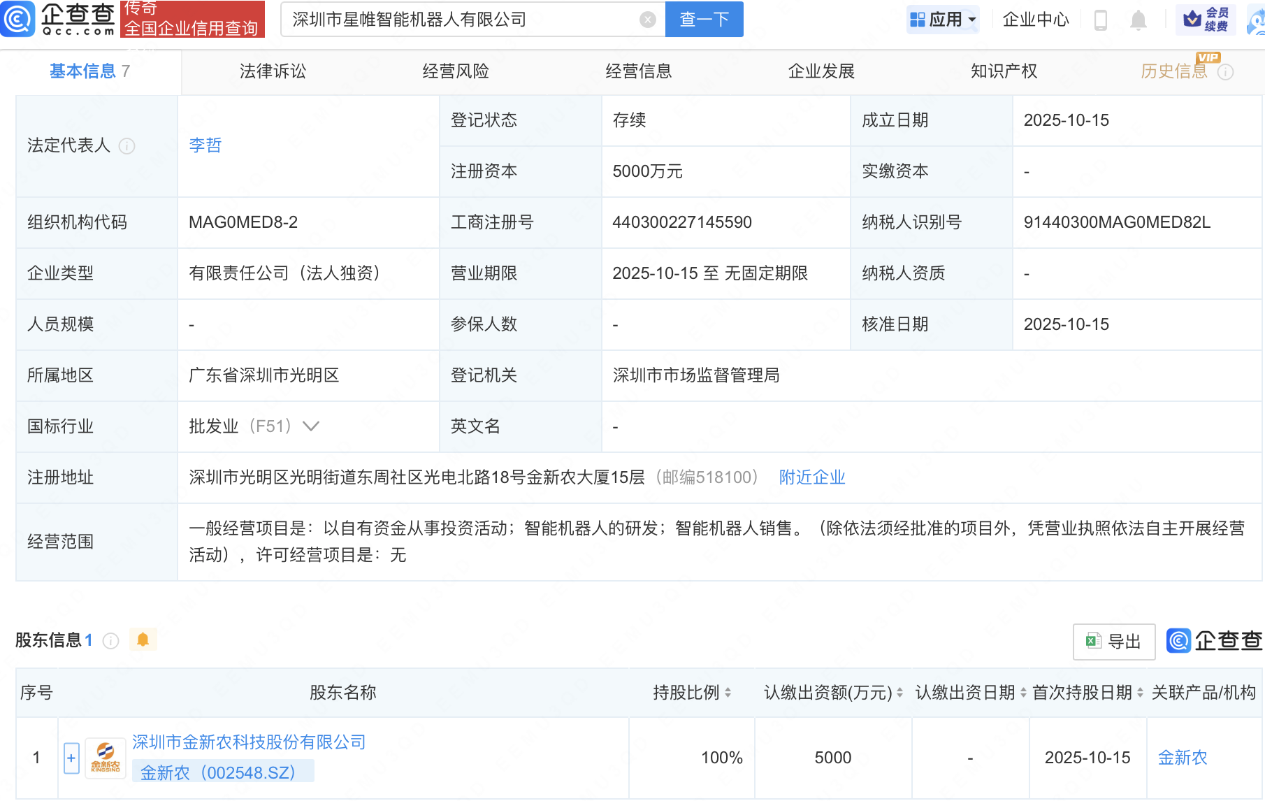 企查查APP显示,近日,深圳市星帷智能机器人有限公司成立,注册资本5000万元,经营范围包含:以自有资金从事投资活动;智能机器人的研发;智能机器人销售。企查查股权穿透显示,该公司由金新农(002548)全资持股。
