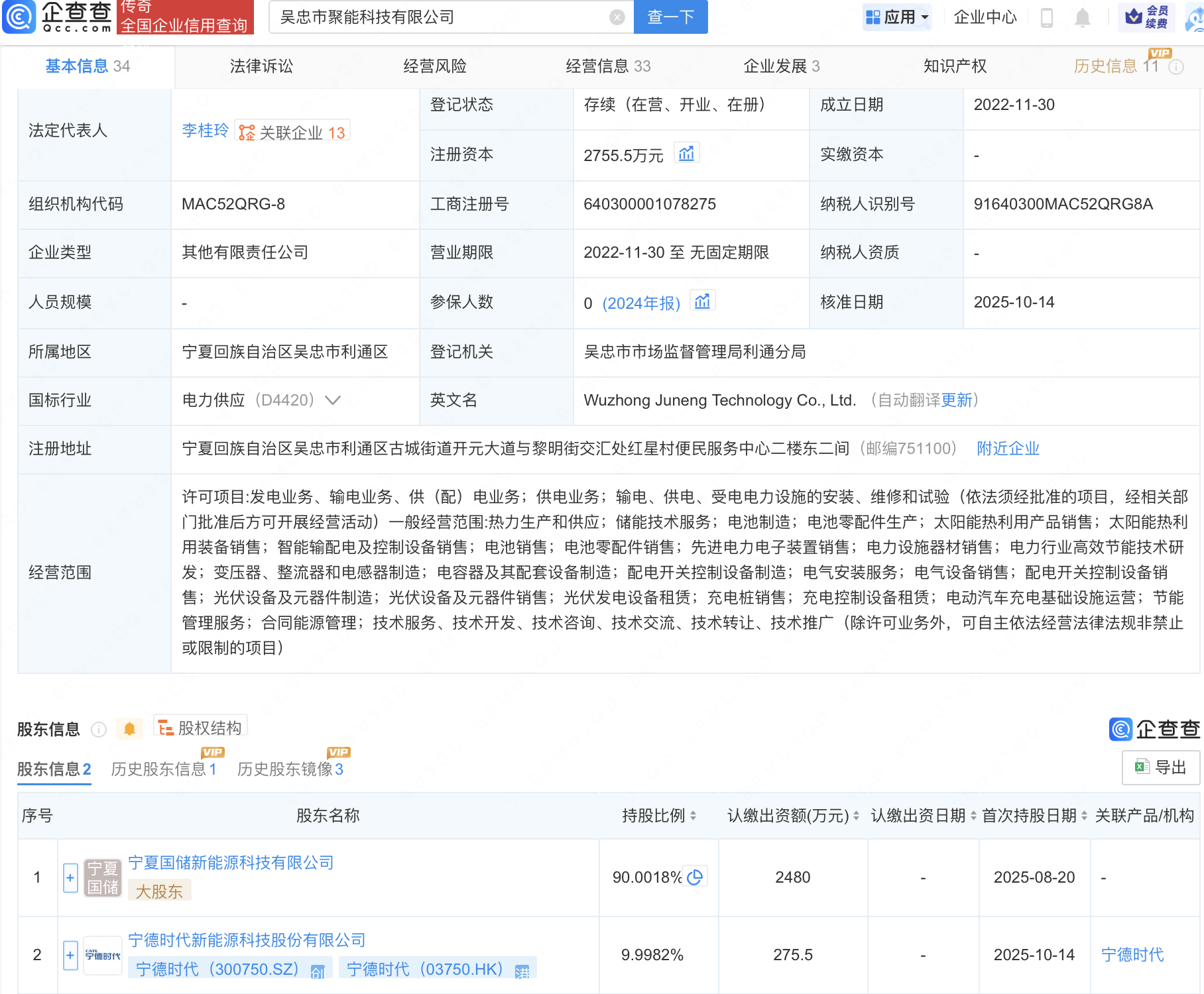 宁德时代入股吴忠市聚能科技公司