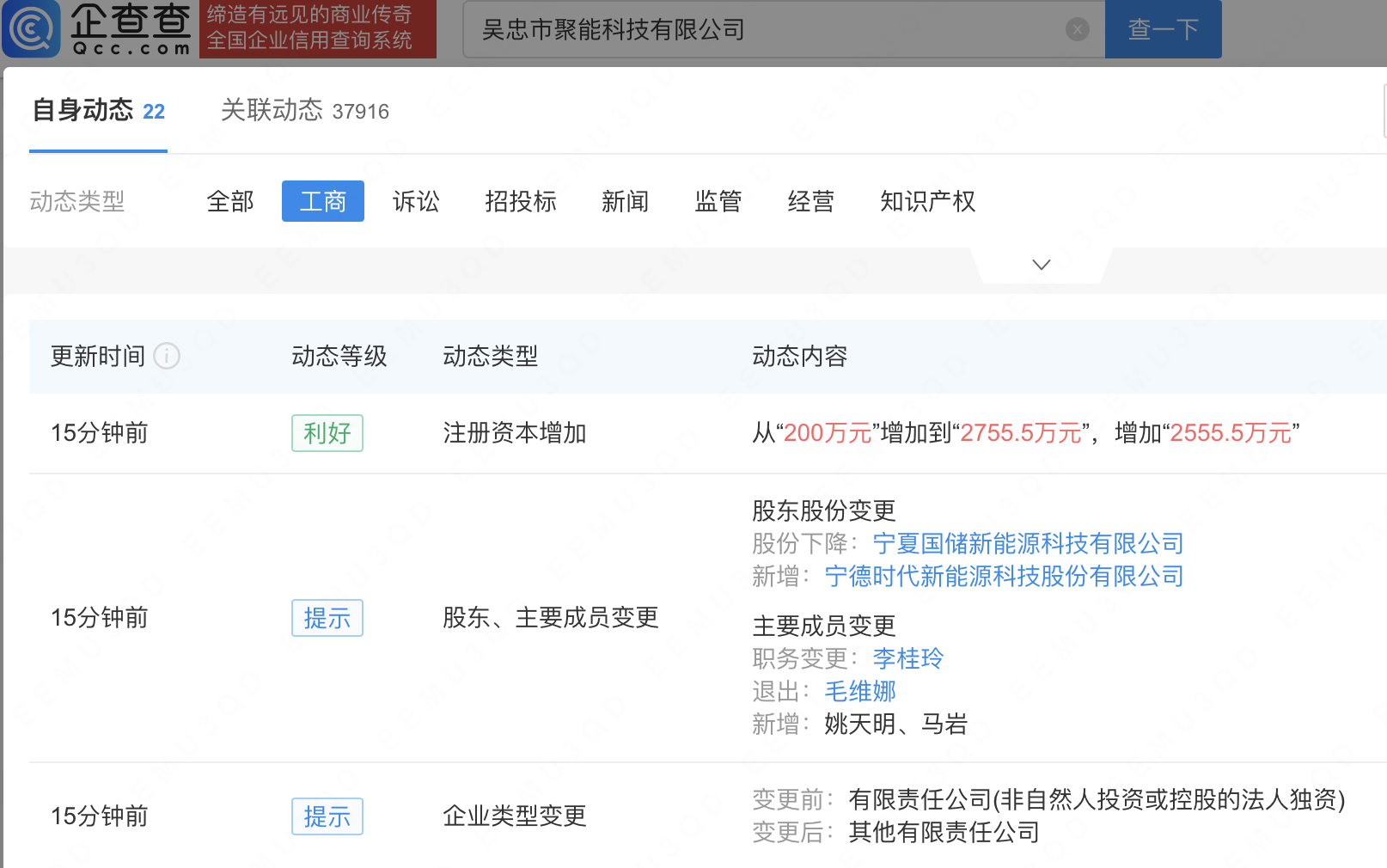 企查查APP显示,近日,吴忠市聚能科技有限公司发生工商变更,新增宁德时代(300750)为股东,同时注册资本增至2755.5万元。企查查信息显示,该公司成立于2022年,法定代表人为李桂玲,经营范围包含:光伏发电设备租赁;充电桩销售;充电控制设备租赁;电动汽车充电基础设施运营等。公开信息显示,该公司曾建设孙家滩100MW/400MWh共享储能电站项目。
