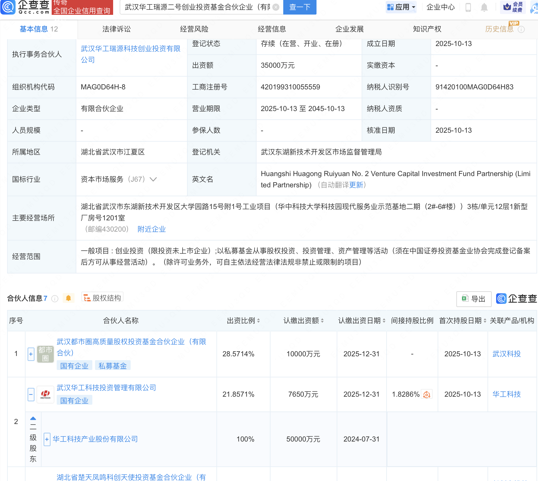 企查查APP显示,近日,武汉华工瑞源二号创业投资基金合伙企业(有限合伙)成立,出资额3.5亿元,经营范围包含:创业投资(限投资未上市企业);以私募基金从事股权投资、投资管理、资产管理等活动。企查查股权穿透显示,该企业由华工科技(000988)全资子公司武汉华工科技投资管理有限公司等共同出资。