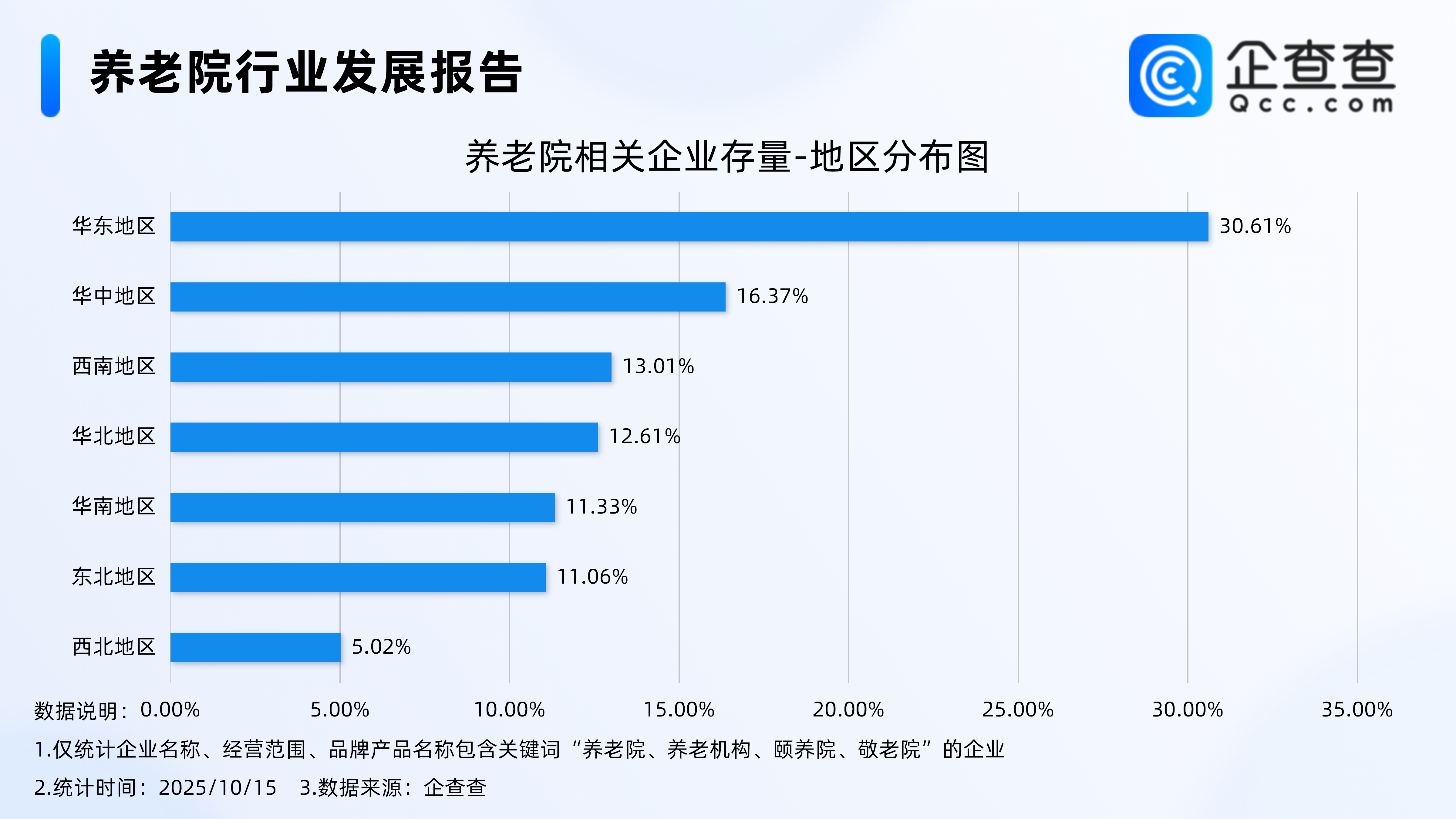 企查查数据显示,从地区分布来看,养老院相关企业主要集中分布在华东地区,占比达30.61%。其次,分布在华中地区、西南地区的相关企业分别占比16.37%、13.01%。