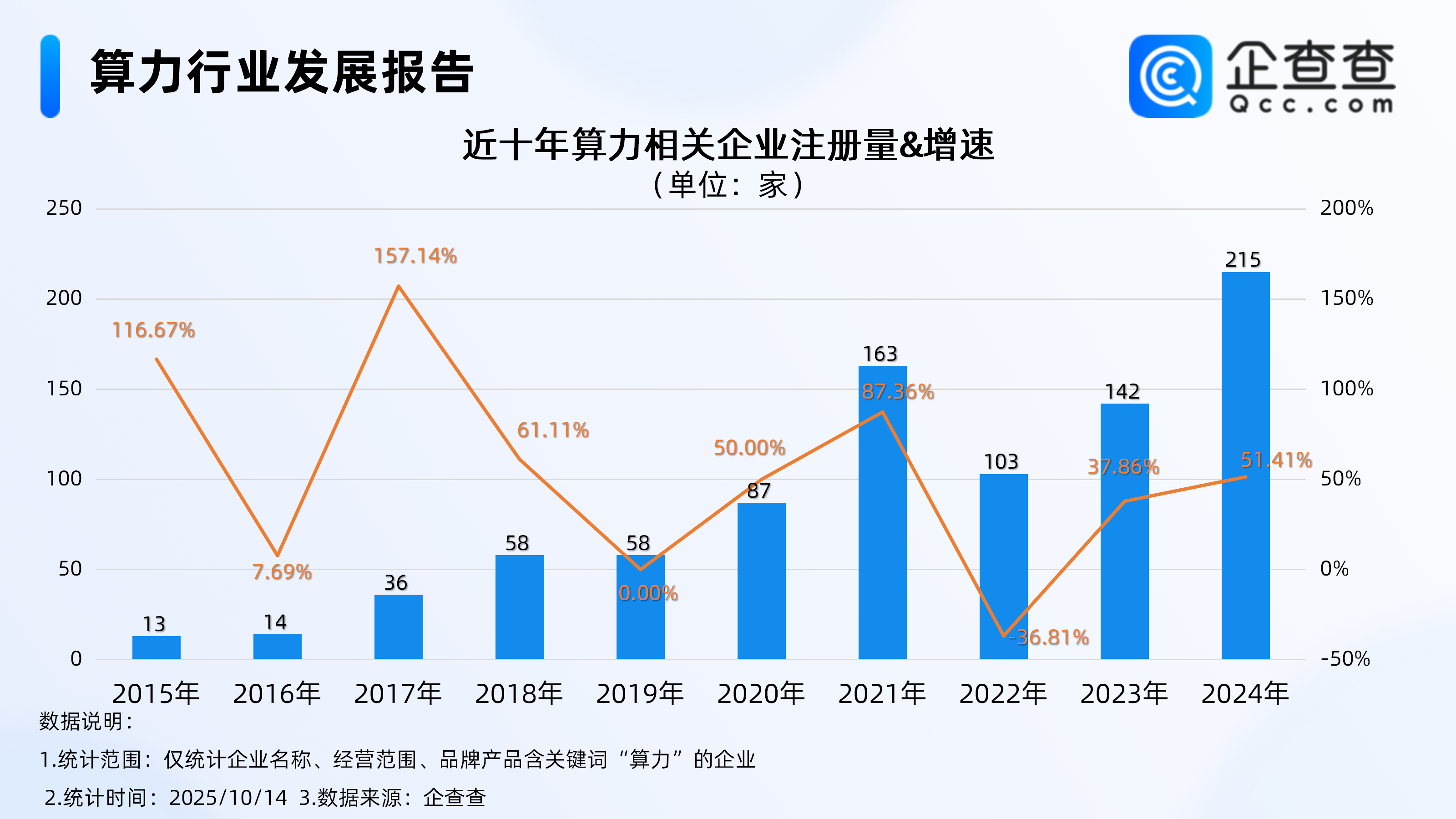 企查查数据显示,注册量方面,近十年算力相关企业年注册量整体呈上升趋势,2024年注册量首次突破200家,达215家,截至目前今年已注册150家。