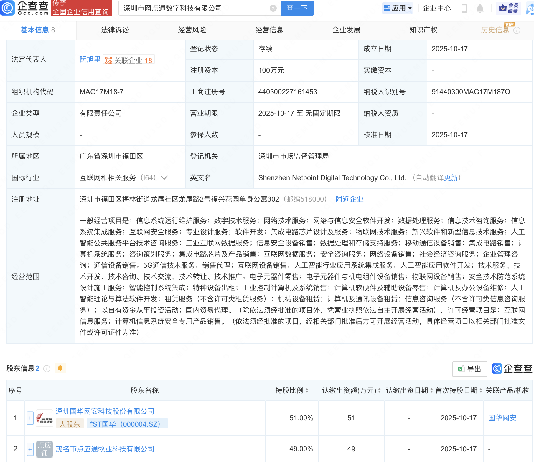 企查查APP显示,近日,深圳市网点通数字科技有限公司成立,法定代表人为阮旭里,经营范围包含:集成电路芯片设计及服务;物联网技术服务;新兴软件和新型信息技术服务;人工智能应用软件开发等。企查查股权穿透显示,该公司由*ST国华(000004)等共同持股。
