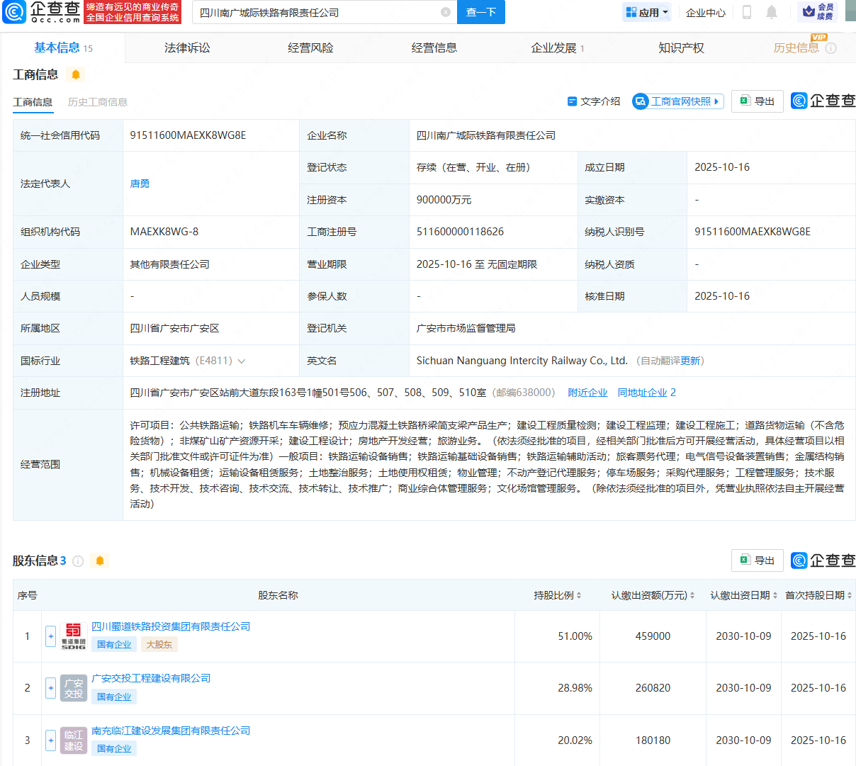 企查查APP显示,近日,四川南广城际铁路有限责任公司成立,法定代表人为唐勇,注册资本为90亿元,经营范围包含:公共铁路运输;铁路机车车辆维修;铁路运输设备销售;铁路运输基础设备销售等。企查查股权穿透显示,该公司由四川蜀道铁路投资集团有限责任公司、广安交投工程建设有限公司、南充临江建设发展集团有限责任公司共同持股。