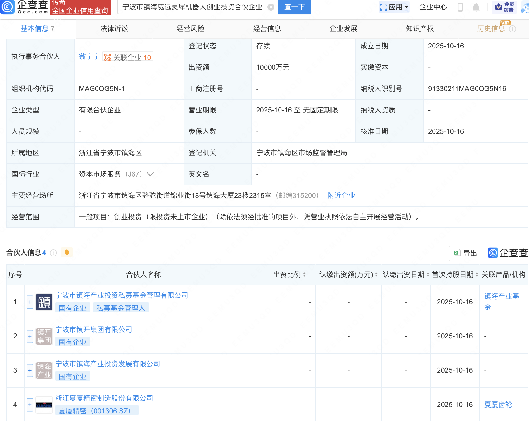 企查查APP显示,近日,宁波市镇海威远灵犀机器人创业投资合伙企业(有限合伙)成立,出资额1亿元,经营范围包含:创业投资(限投资未上市企业)。企查查股权穿透显示,该企业由夏厦精密(001306)等共同出资。