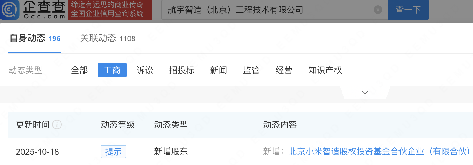 企查查APP显示,近日,航宇智造(北京)工程技术有限公司发生工商变更,新增北京小米智造股权投资基金合伙企业(有限合伙)为股东。企查查信息显示,该公司成立于2013年,法定代表人为程鹏志,经营范围包含:机械设备研发;汽车零部件及配件制造;汽车零部件再制造;人工智能应用软件开发等。据其官网,该公司把成熟的航空轻量化制造技术应用于汽车。