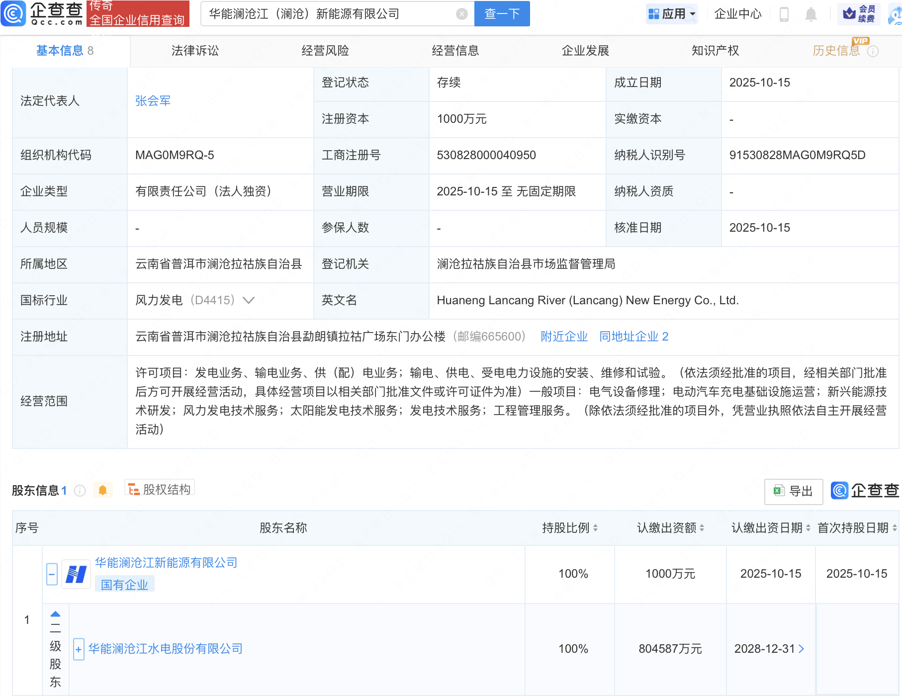 企查查APP显示,近日,华能澜沧江(澜沧)新能源有限公司成立,注册资本1000万元,经营范围包含:电动汽车充电基础设施运营;新兴能源技术研发;风力发电技术服务;太阳能发电技术服务等。企查查股权穿透显示,该公司由华能水电(600025)间接全资持股。