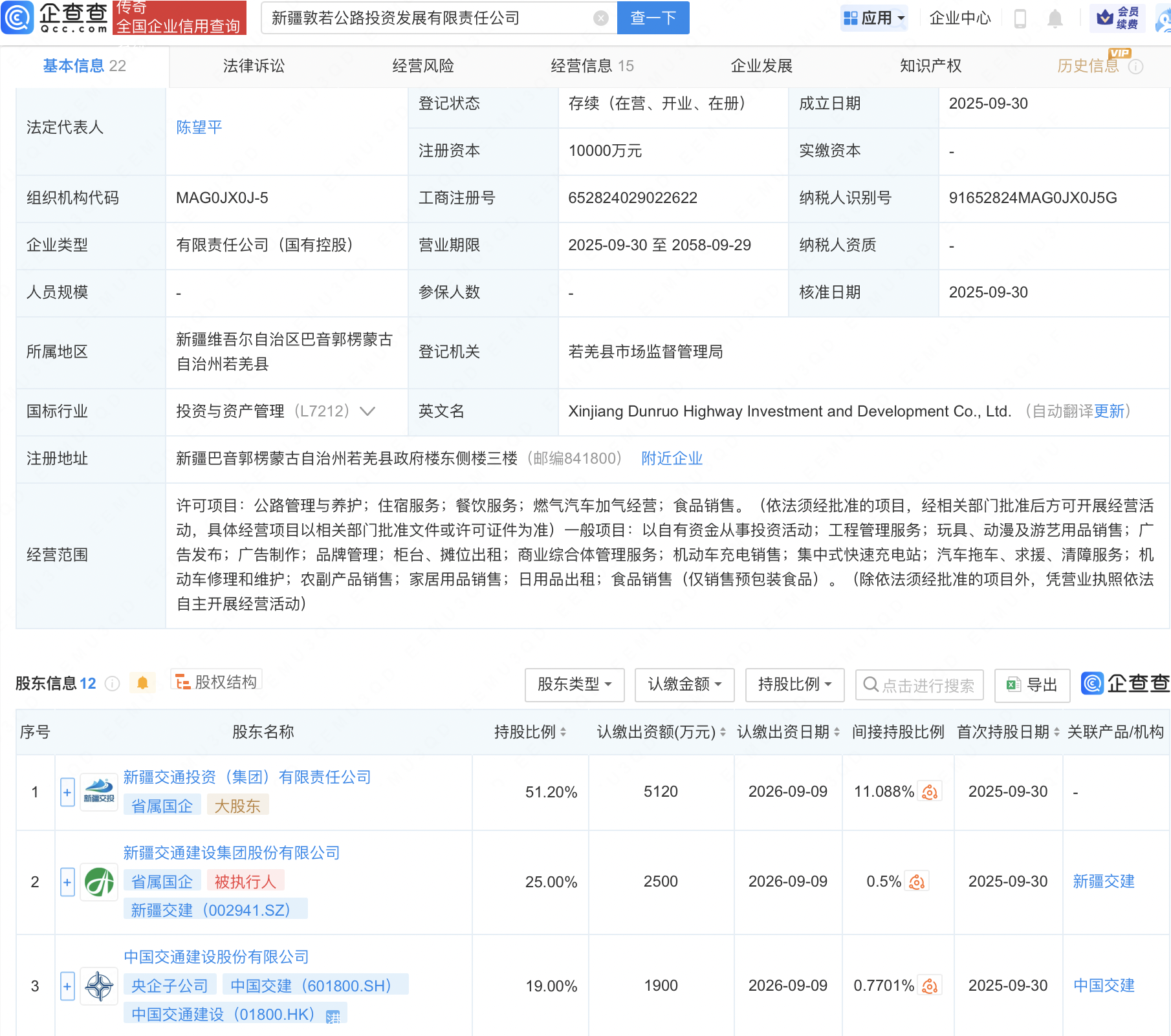 企查查APP显示,近日,新疆敦若公路投资发展有限责任公司成立,注册资本1亿元,经营范围包含:机动车充电销售;集中式快速充电站;汽车拖车、求援、清障服务等。企查查股权穿透显示,该公司由新疆交建(002941)、中国交建(601800)等共同持股。