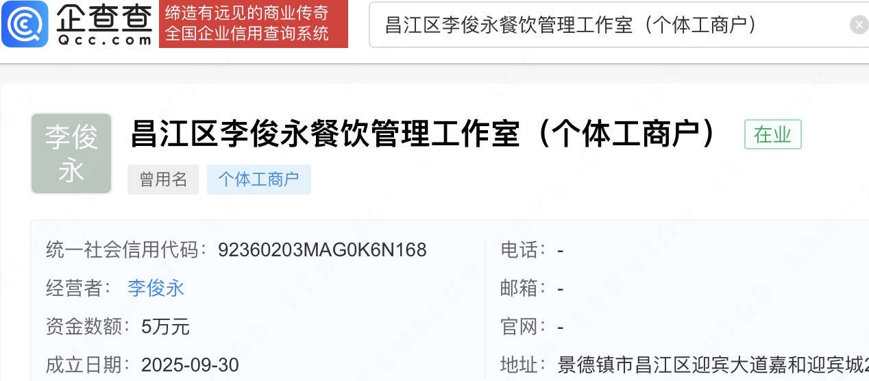 企查查APP显示,近日,景德镇市珠山区李俊永餐饮管理工作室(个体工商户)发生工商变更,企业名称变更为昌江区李俊永餐饮管理工作室(个体工商户),经营范围去除食品销售(仅销售预包装食品),同时经营地址也发生变更。该工作室成立于今年9月,为个体工商户,经营者为李俊永(鸡排哥),资金数额5万人民币。