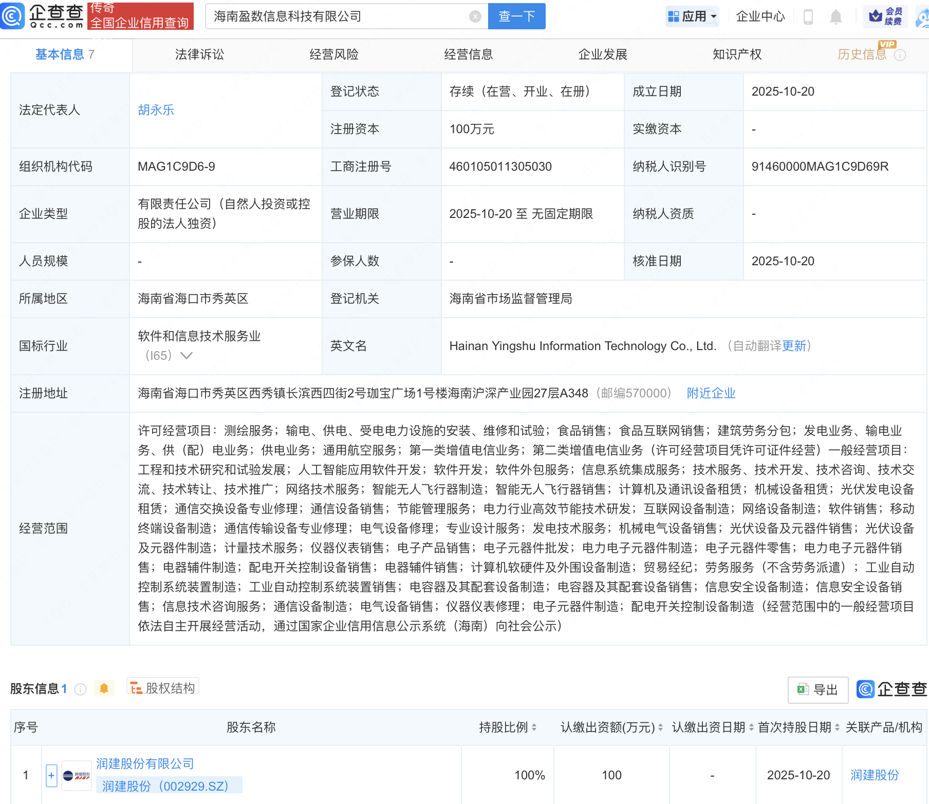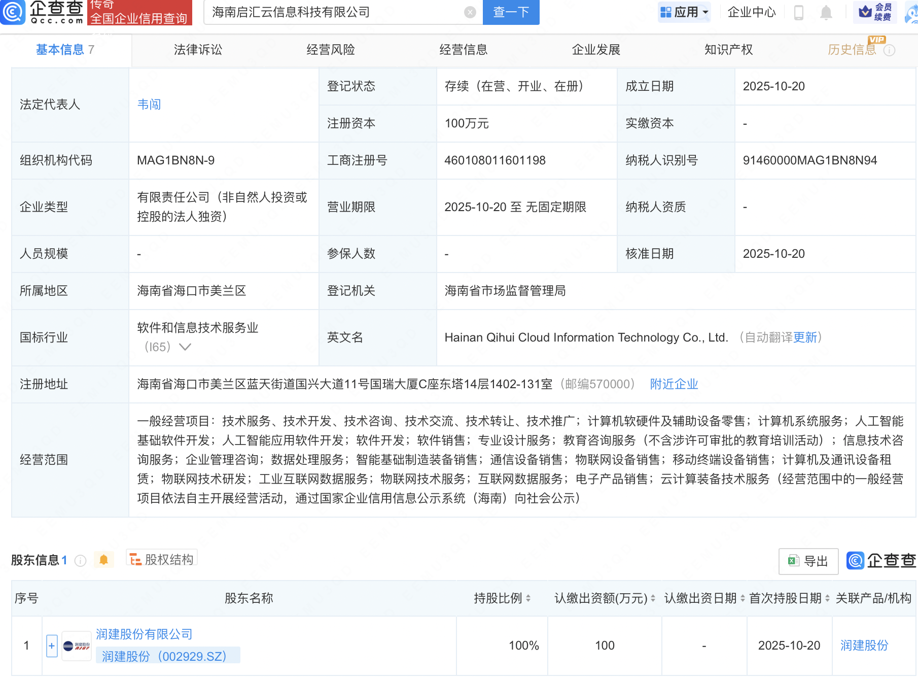 企查查APP显示,近日,海南启汇云信息科技有限公司、海南盈数信息科技有限公司成立,法定代表人分别为韦闯、胡永乐,经营范围均包含:人工智能应用软件开发;软件开发等。企查查股权穿透显示,二者皆由润建股份(002929)全资持股。