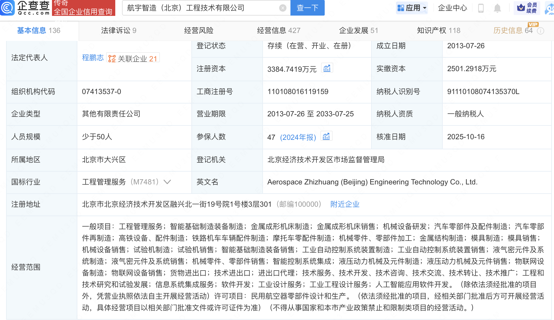 企查查APP显示,近日,航宇智造(北京)工程技术有限公司发生工商变更,新增北京小米智造股权投资基金合伙企业(有限合伙)为股东。企查查信息显示,该公司成立于2013年,法定代表人为程鹏志,经营范围包含:机械设备研发;汽车零部件及配件制造;汽车零部件再制造;人工智能应用软件开发等。据其官网,该公司把成熟的航空轻量化制造技术应用于汽车。