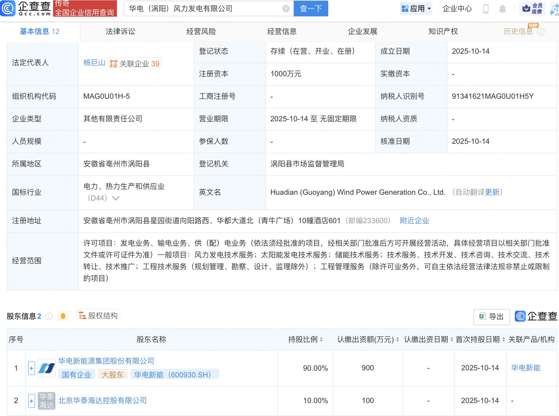 企查查APP显示,近日,华电(涡阳)风力发电有限公司成立,注册资本1000万元,经营范围包含:风力发电技术服务;太阳能发电技术服务;储能技术服务等。企查查股权穿透显示,该公司由华电新能(600930)等共同持股。