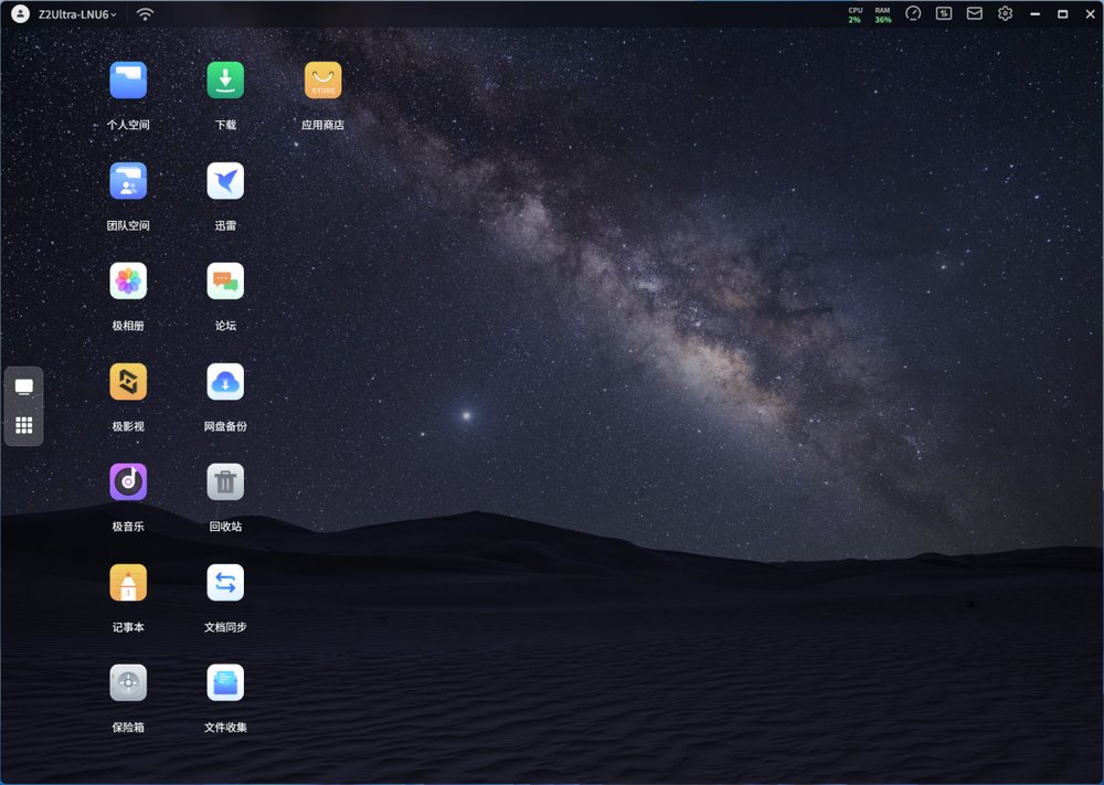 极空间Z2 Ultra的软件体验以“零门槛”为核心。设备配网仅需三步:安装硬盘、接入电源和网络,随后根据提示完成初始化。其兼容性覆盖浏览器、手机APP、电脑客户端、TV端及小程序,支持安卓、iOS、macOS等多平台,用户可随时随地访问数据。Windows客户端搭载极空间ZOS 2.0系统,操作界面直观,功能模块清晰,应用商店支持官方应用、第三方应用及Docker应用的安装与升级,用户无需等待系统大版本更新即可获取新功能。