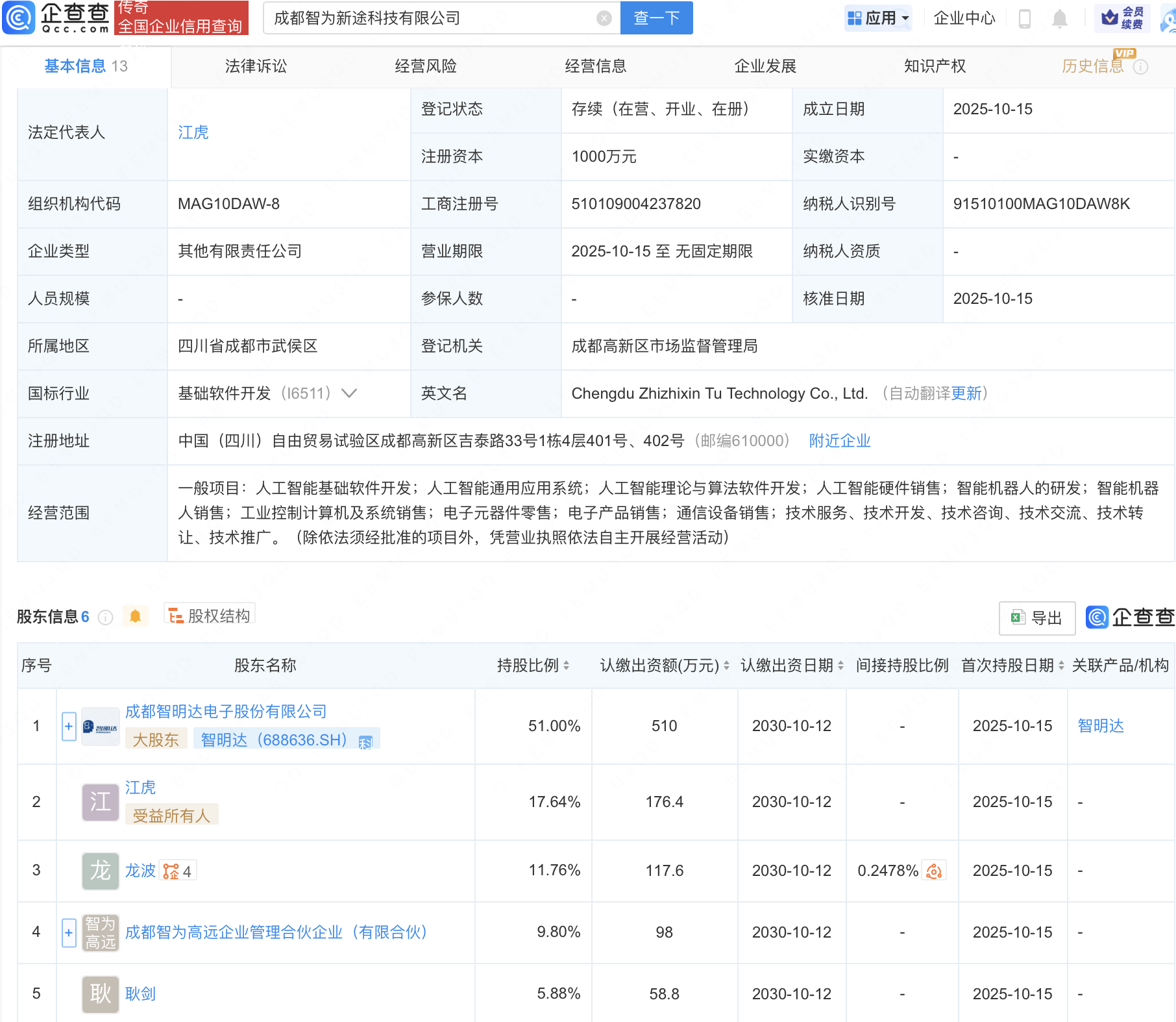 企查查APP显示,近日,成都智为新途科技有限公司成立,注册资本1000万元,经营范围包含:人工智能理论与算法软件开发;人工智能硬件销售;智能机器人的研发;智能机器人销售等。企查查股权穿透显示,该公司由智明达(688636)等共同持股。