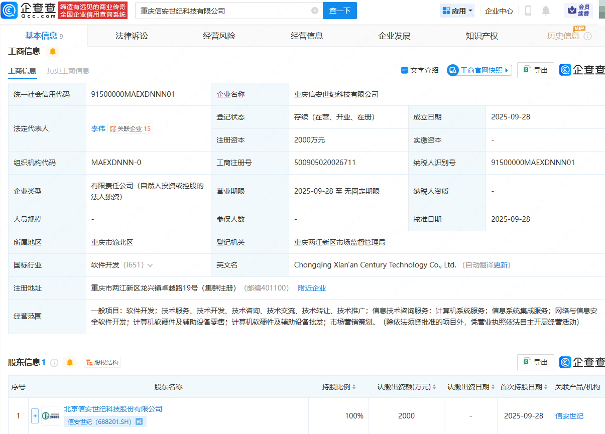 企查查APP显示,近日,重庆信安世纪科技有限公司成立,法定代表人为李伟,注册资本为2000万元,经营范围包含:信息技术咨询服务;计算机系统服务;信息系统集成服务;网络与信息安全软件开发等。企查查股权穿透显示,该公司由信安世纪(688201)全资持股。