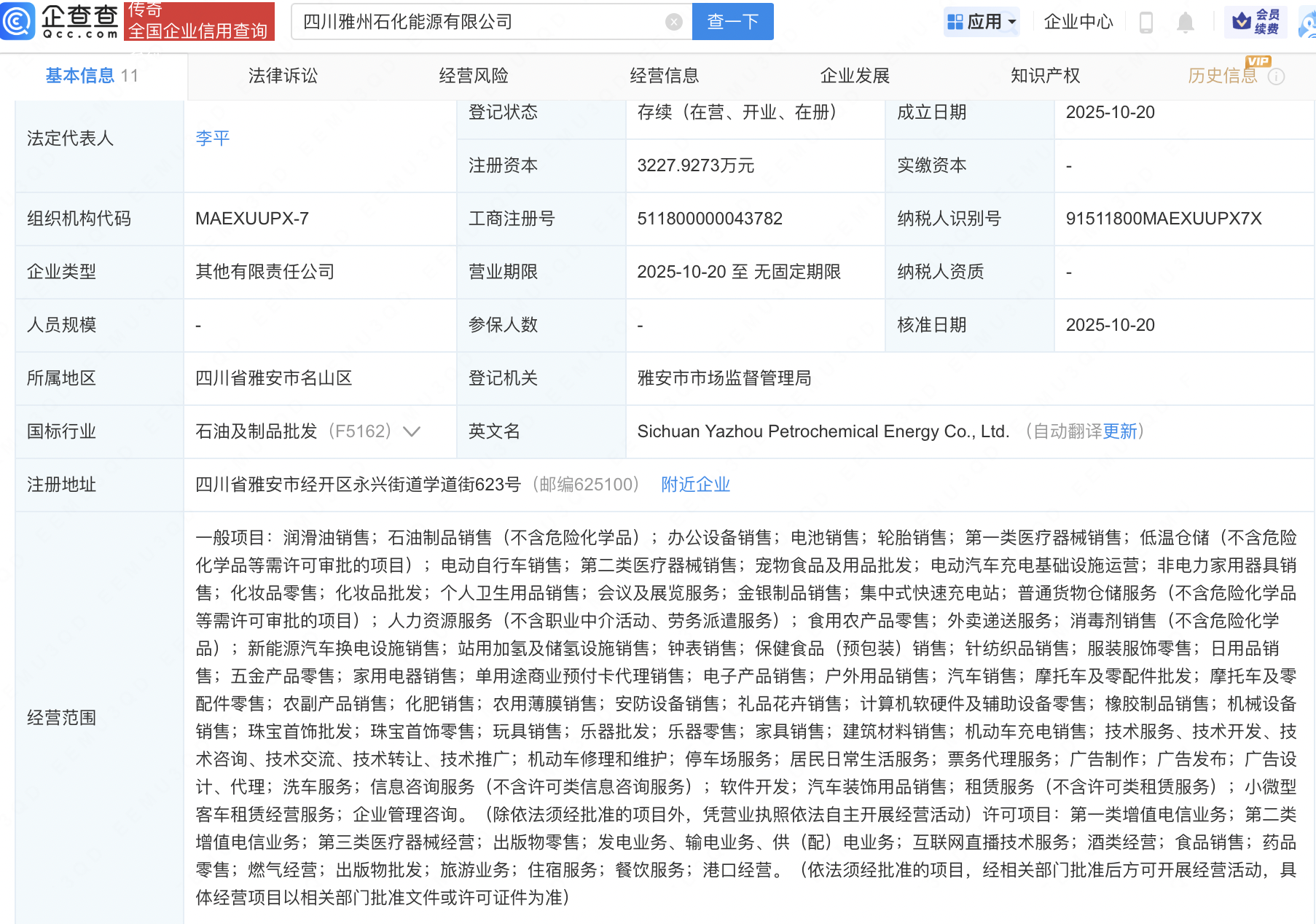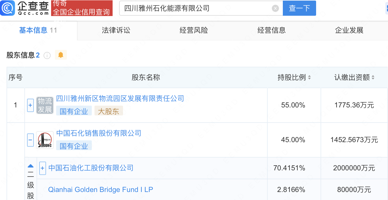 企查查APP显示,近日,四川雅州石化能源有限公司成立,法定代表人为李平,经营范围包含:电动汽车充电基础设施运营;新能源汽车换电设施销售;站用加氢及储氢设施销售等。企查查股权穿透显示,该公司由中国石化(600028)旗下中国石化销售股份有限公司等共同持股。