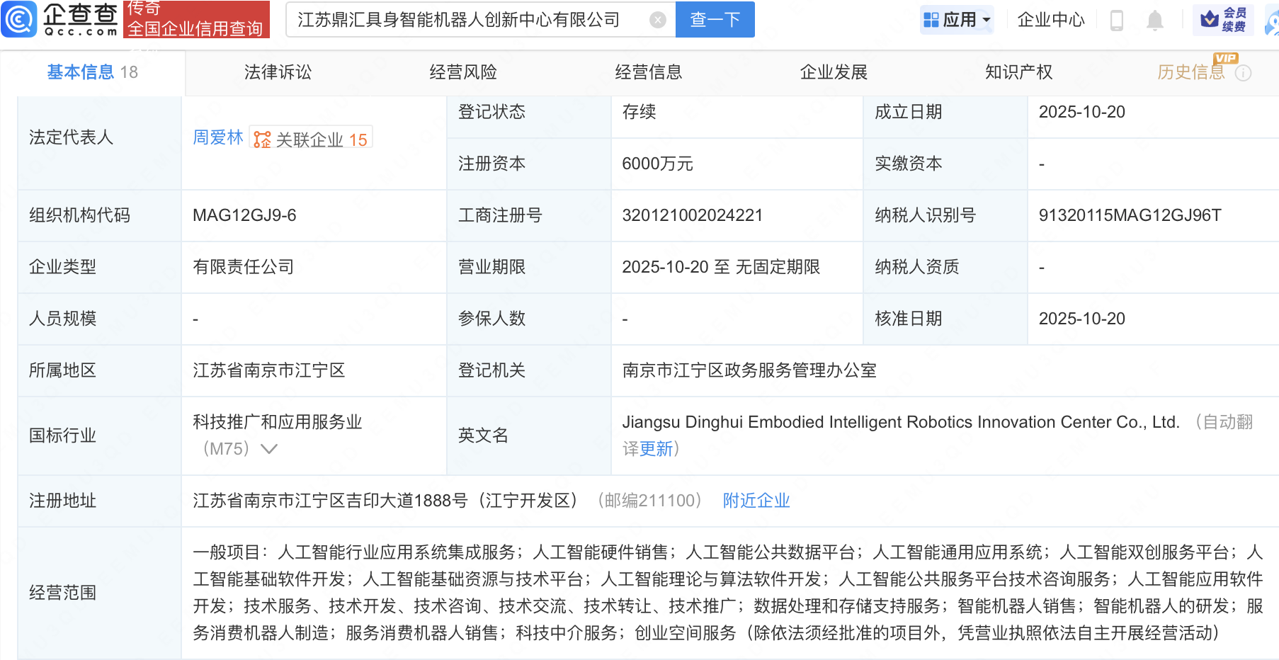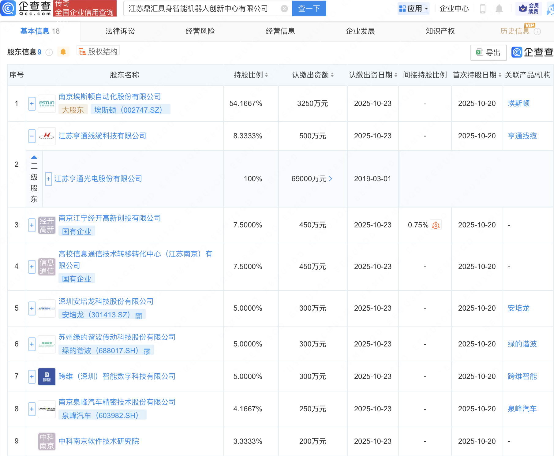 企查查APP显示,近日,江苏鼎汇具身智能机器人创新中心有限公司成立,注册资本6000万元,经营范围包含:人工智能行业应用系统集成服务;人工智能硬件销售;智能机器人销售;智能机器人的研发等。企查查股权穿透显示,该公司由埃斯顿(002747)、亨通光电(600487)全资子公司江苏亨通线缆科技有限公司、安培龙(301413)、绿的谐波(688017)、泉峰汽车(603982)等共同持股。