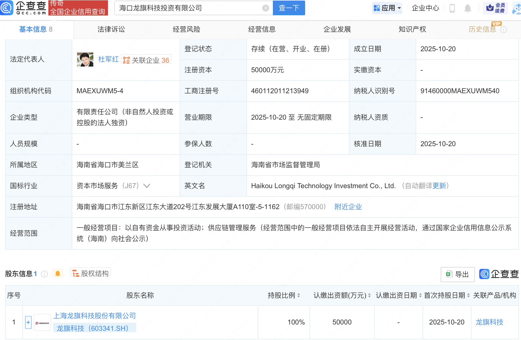 企查查APP显示,近日,海口龙旗科技投资有限公司成立,注册资本5亿元,经营范围包含:以自有资金从事投资活动;供应链管理服务。企查查股权穿透显示,该公司由龙旗科技(603341)全资持股。