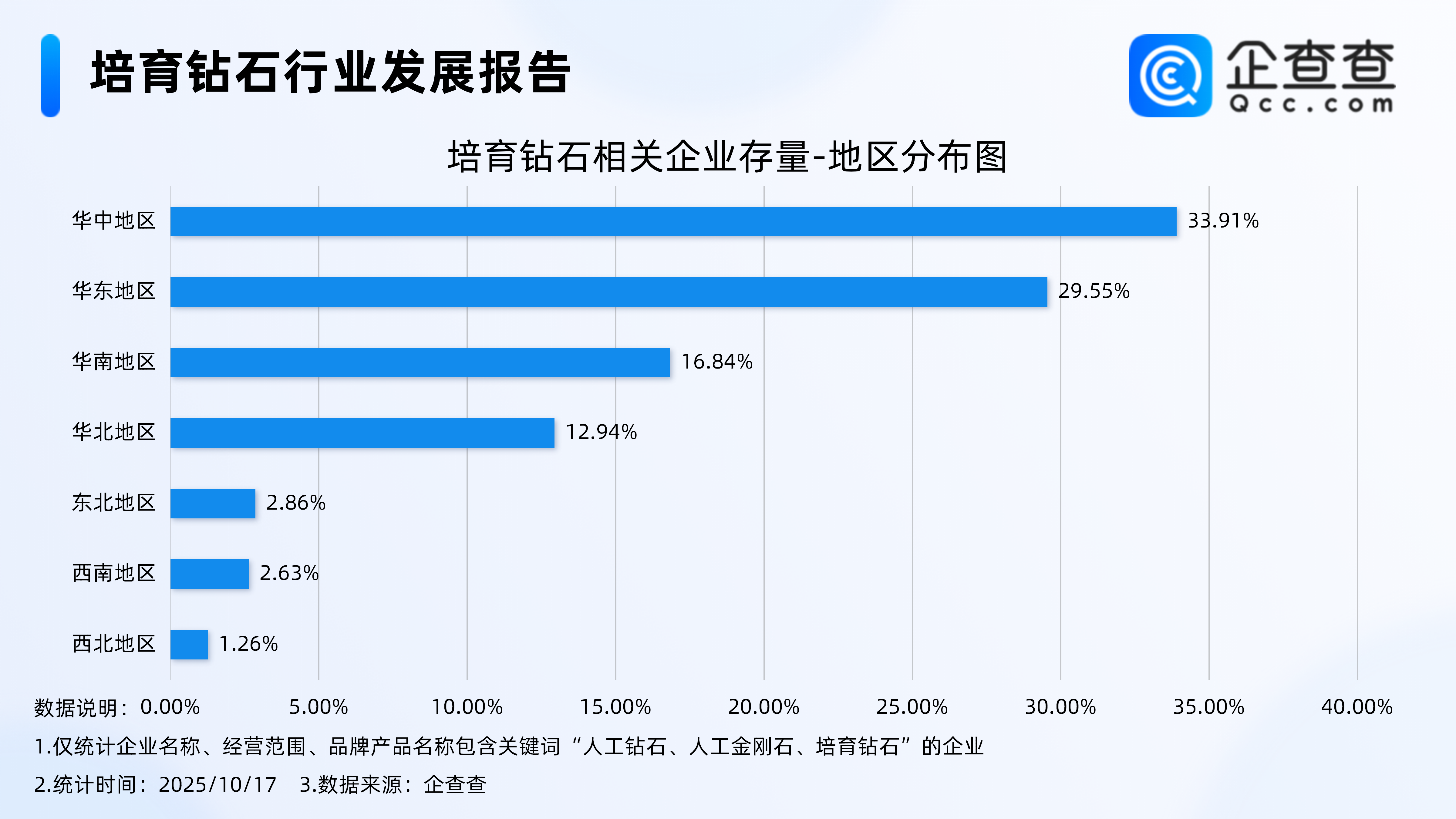 企查查数据显示,从地区分布来看,培育钻石相关企业多分布在华中地区和华东地区,分别占比33.91%、29.55%。其次,分布在华南地区、华北地区的相关企业分别占比16.84%、12.94%。