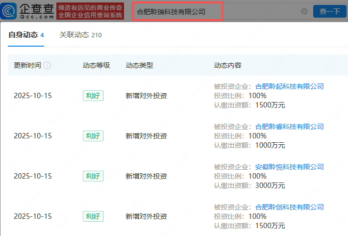 企查查APP显示,近日,合肥聆起科技有限公司、合肥聆睿科技有限公司、安徽聆悦科技有限公司、合肥聆创科技有限公司成立,均由合肥聆瑞科技有限公司全资持股。企查查股权穿透显示,合肥聆瑞科技有限公司由科大讯飞(002230)全资子公司安徽讯飞云创科技有限公司等共同持股。