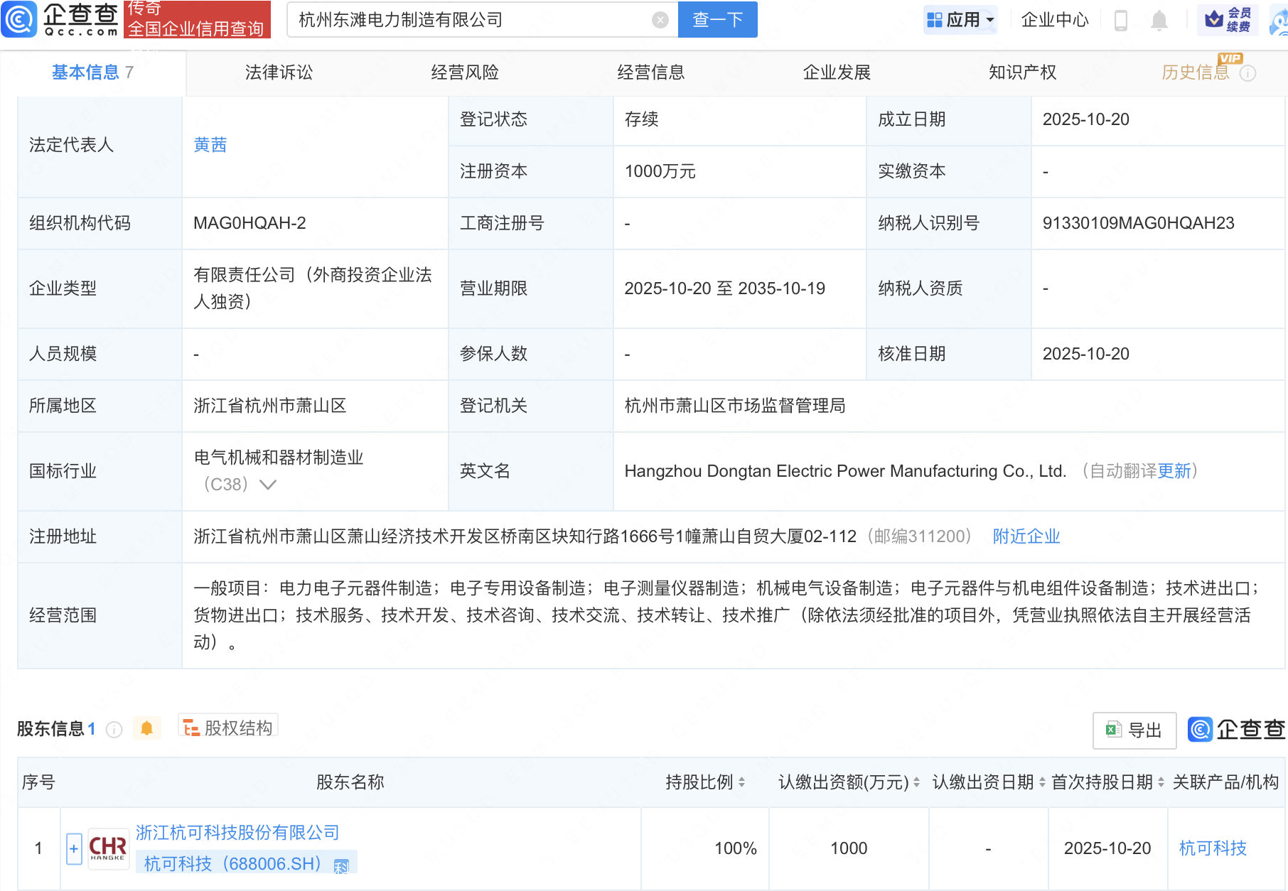 企查查APP显示,近日,杭州东滩电力制造有限公司成立,注册资本1000万元,经营范围包含:电力电子元器件制造;电子专用设备制造;电子测量仪器制造等。企查查股权穿透显示,该公司由杭可科技(688006)全资持股。