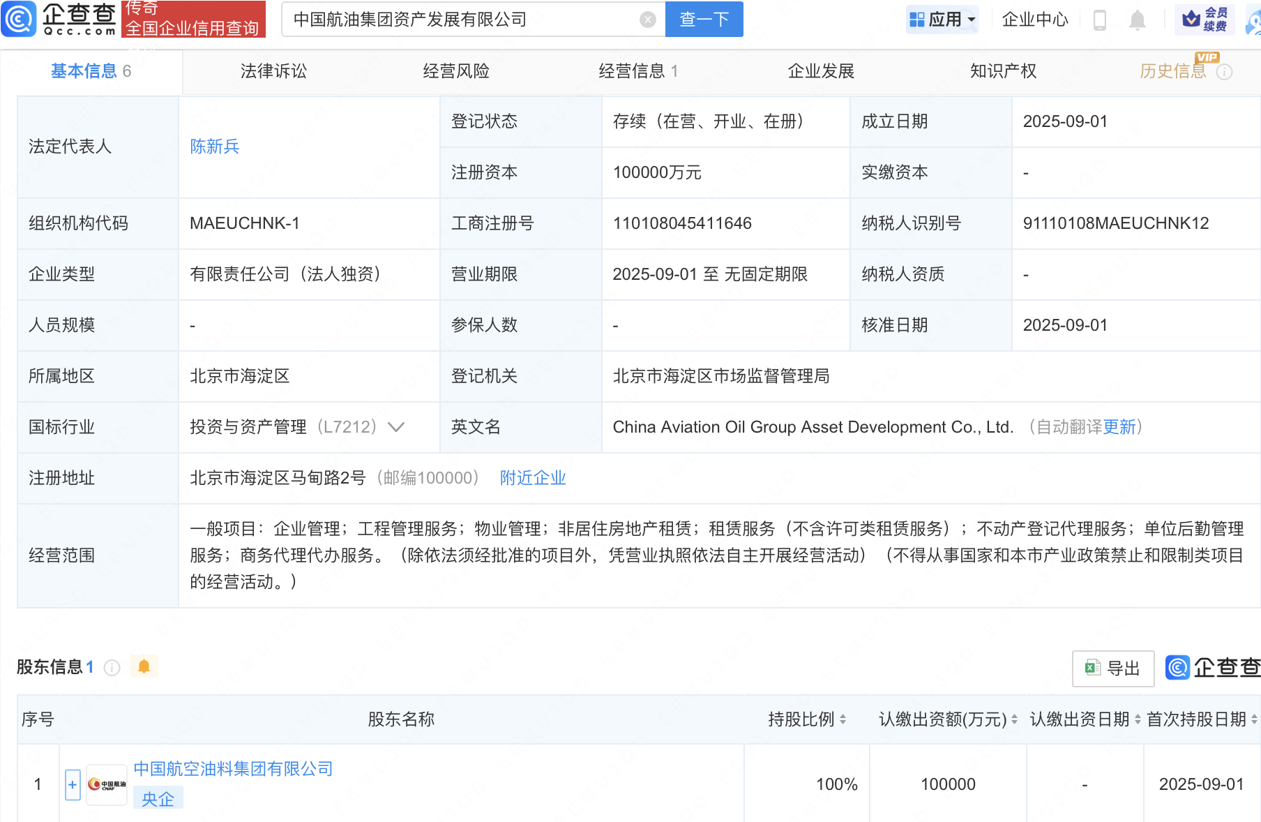 企查查APP显示,近日,中国航油集团资产发展有限公司成立,注册资本10亿元,经营范围包含:不动产登记代理服务;单位后勤管理服务;商务代理代办服务等。企查查股权穿透显示,该公司由中国航空油料集团有限公司全资持股。