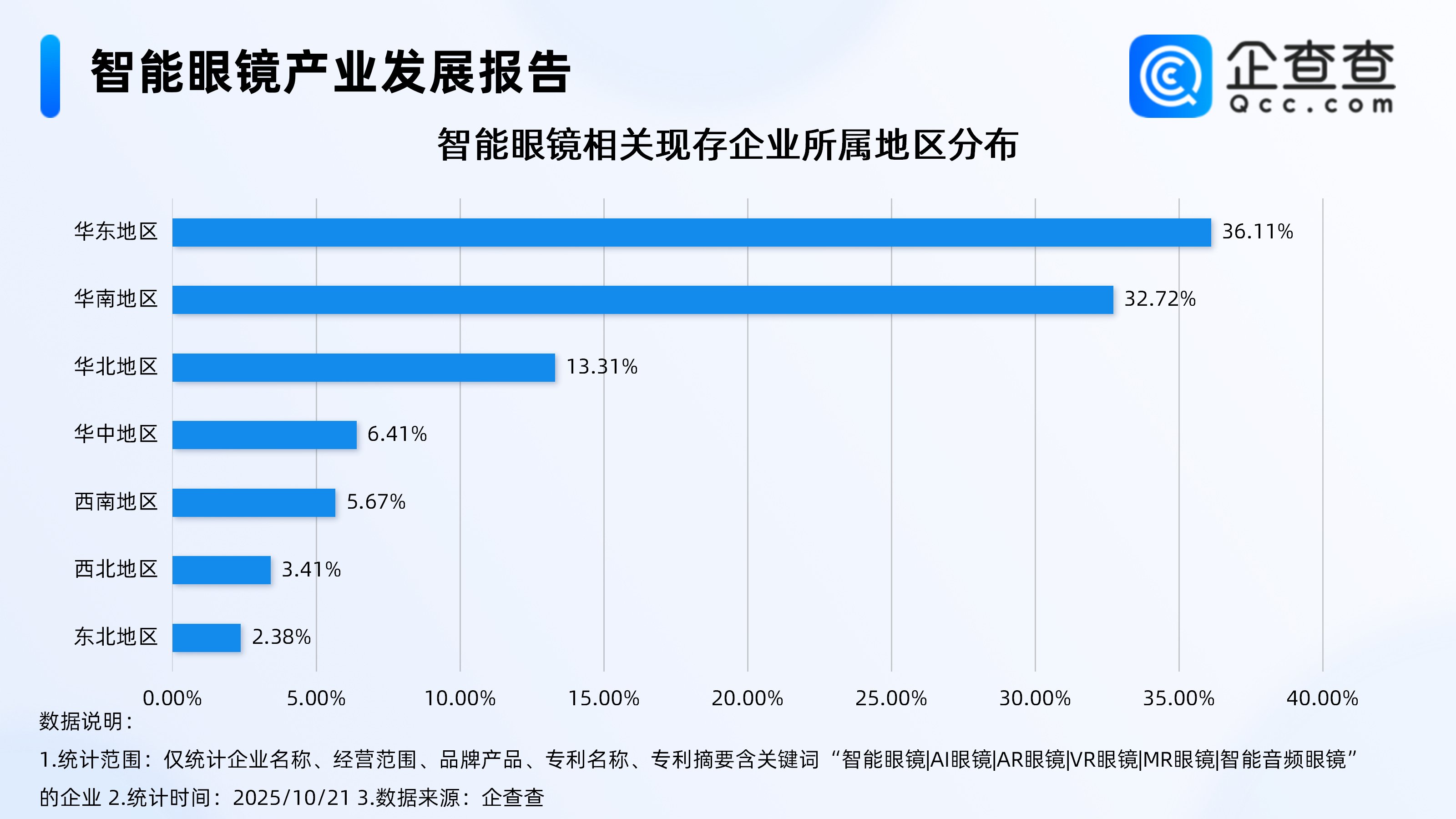 企查查数据显示,截至10月21日,国内智能眼镜相关企业现存量达5682家,主要分布在华东、华南两地,分别占比36.11%、32.72%。分布在华北地区的相关企业占比达13.31%,位于华中、西南、西北、东北地区的智能眼镜相关企业,占比均不到10%。