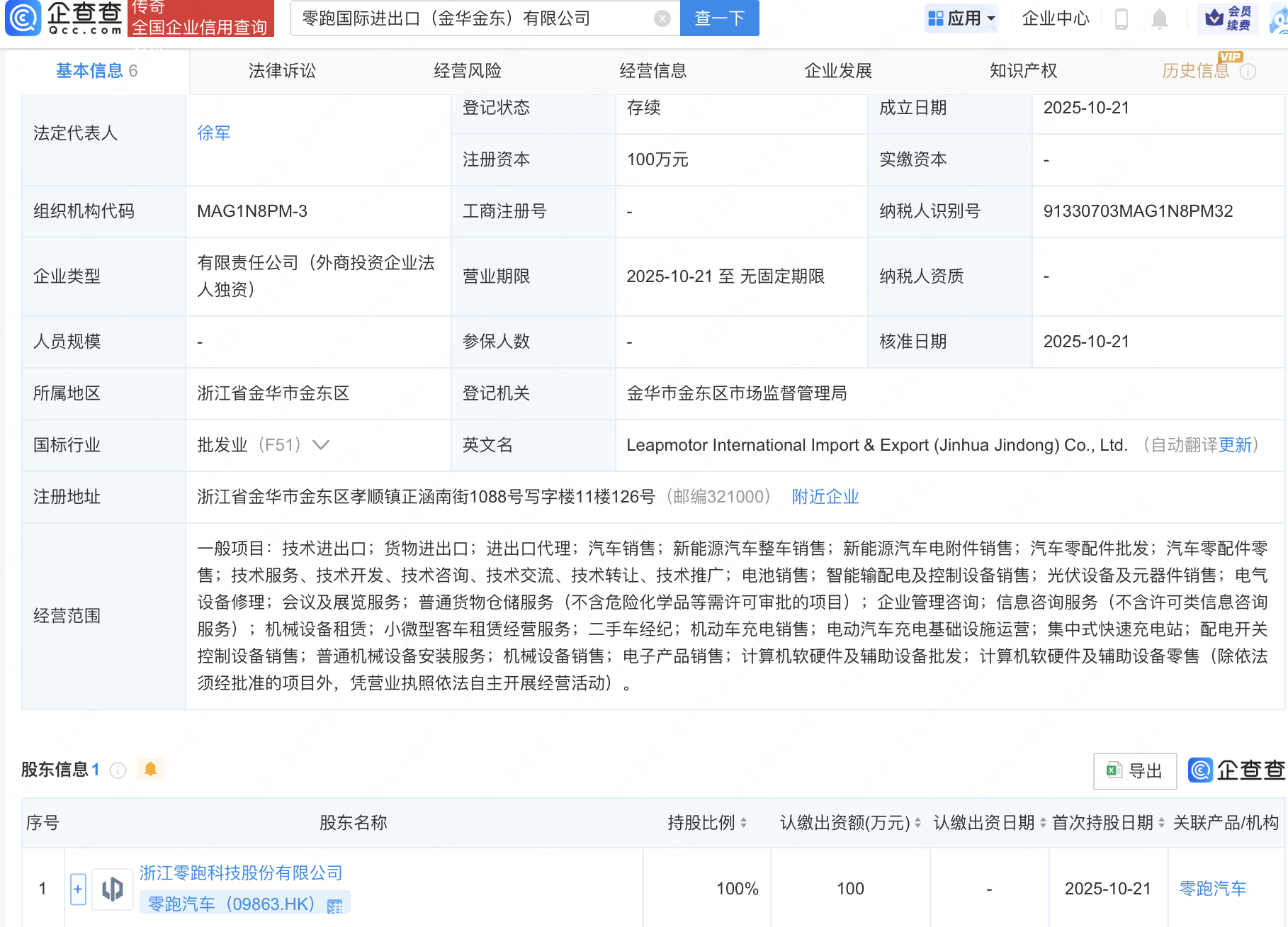 企查查APP显示,近日,零跑国际进出口(金华金东)有限公司成立,法定代表人为徐军,经营范围包含:新能源汽车整车销售;新能源汽车电附件销售;小微型客车租赁经营服务;二手车经纪;机动车充电销售等。企查查股权穿透显示,该公司由零跑汽车(09863.HK)全资持股。