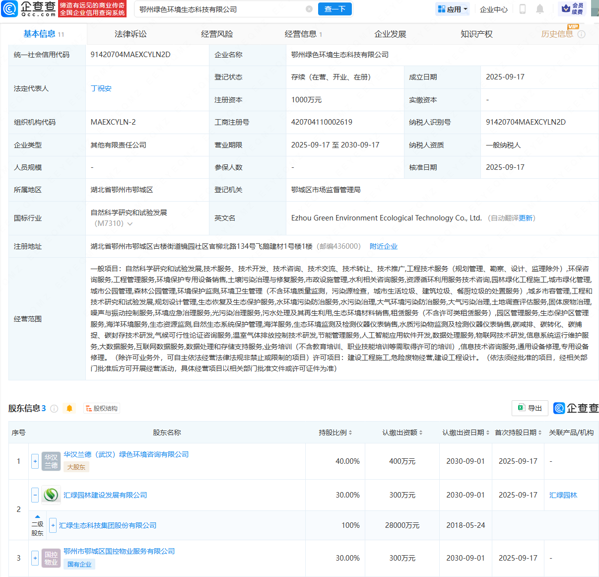 企查查APP显示,近日,鄂州绿色环境生态科技有限公司成立,法定代表人为丁祝安,注册资本为1000万元,经营范围包含:环保咨询服务;环境保护专用设备销售;水利相关咨询服务;资源循环利用服务技术咨询等。企查查股权穿透显示,该公司由华汉兰德(武汉)绿色环境咨询有限公司、汇绿生态(001267)全资子公司汇绿园林建设发展有限公司等共同持股。