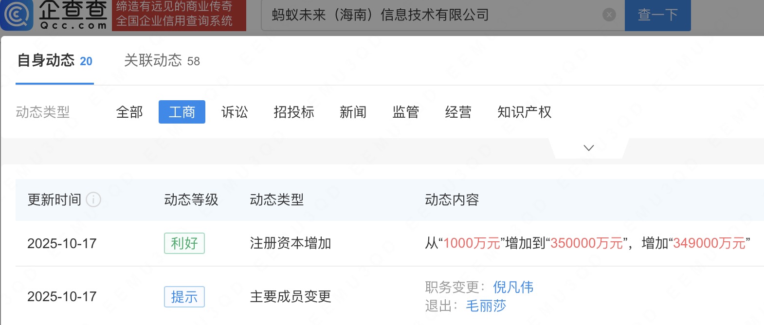 企查查APP显示,近日,蚂蚁未来(海南)信息技术有限公司发生工商变更,注册资本由1000万人民币增至35亿人民币。企查查信息显示,该公司成立于2018年,法定代表人为倪凡伟,经营范围包括信息技术咨询服务、软件开发与设计、接受金融机构委托从事金融信息技术外包等,由蚂蚁科技集团股份有限公司间接全资持股。