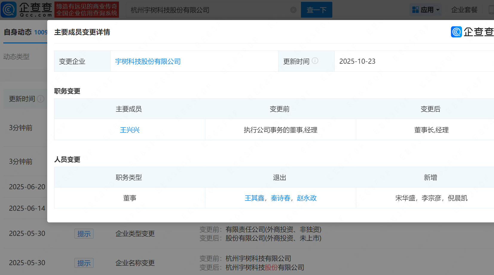 企查查APP显示,10月23日,杭州宇树科技股份有限公司发生工商变更,企业名称变更为宇树科技股份有限公司,同时王兴兴由执行公司事务的董事变更为董事长。企查查信息显示,该公司成立于2016年8月,法定代表人为王兴兴,注册资本约3.64亿人民币,经营范围包含智能机器人的研发、智能机器人销售、工业机器人制造等,由王兴兴、汉海信息技术(上海)有限公司等共同持股。