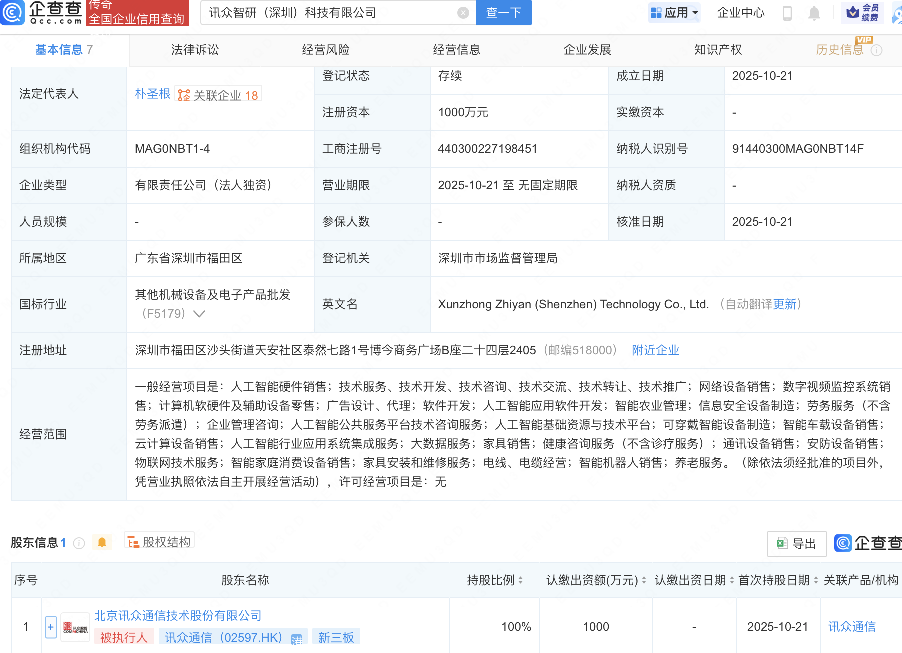 企查查APP显示,近日,讯众智研(深圳)科技有限公司成立,注册资本1000万元,经营范围包含:人工智能公共服务平台技术咨询服务;人工智能基础资源与技术平台;可穿戴智能设备制造;智能机器人销售等。企查查股权穿透显示,该公司由讯众通信(02597.HK)全资持股。
