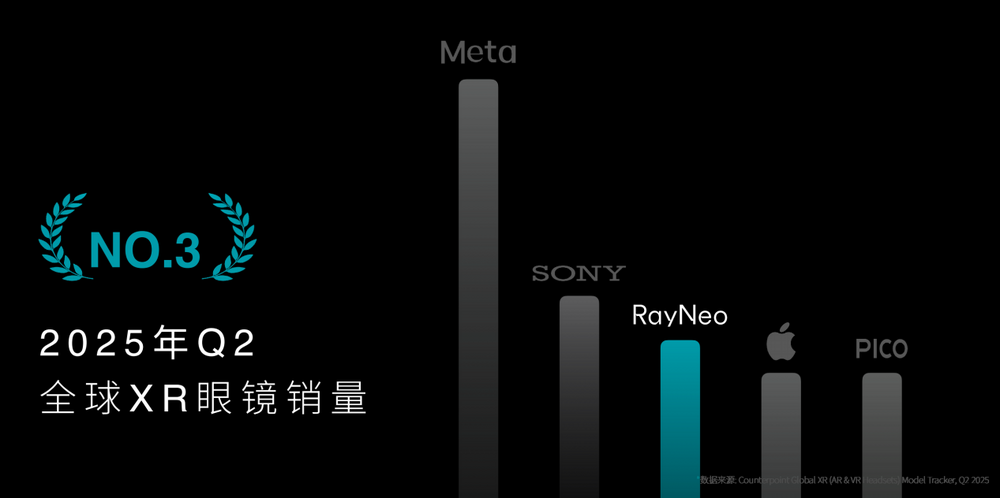 市场数据印证了雷鸟创新的技术领导力。据Counterpoint Research统计,2025年第二季度,雷鸟以39%的份额登顶全球AR眼镜市场,并在XR设备(含VR头显)整体排名中超越苹果跃居第三。其长三角光学与整机生产基地的落地,为技术研发与大规模量产提供了双重保障。此前,雷鸟X3 Pro已入选《时代》杂志“2025年度最佳发明”,与苹果、华为等巨头同台竞技,彰显中国科技品牌的全球影响力。