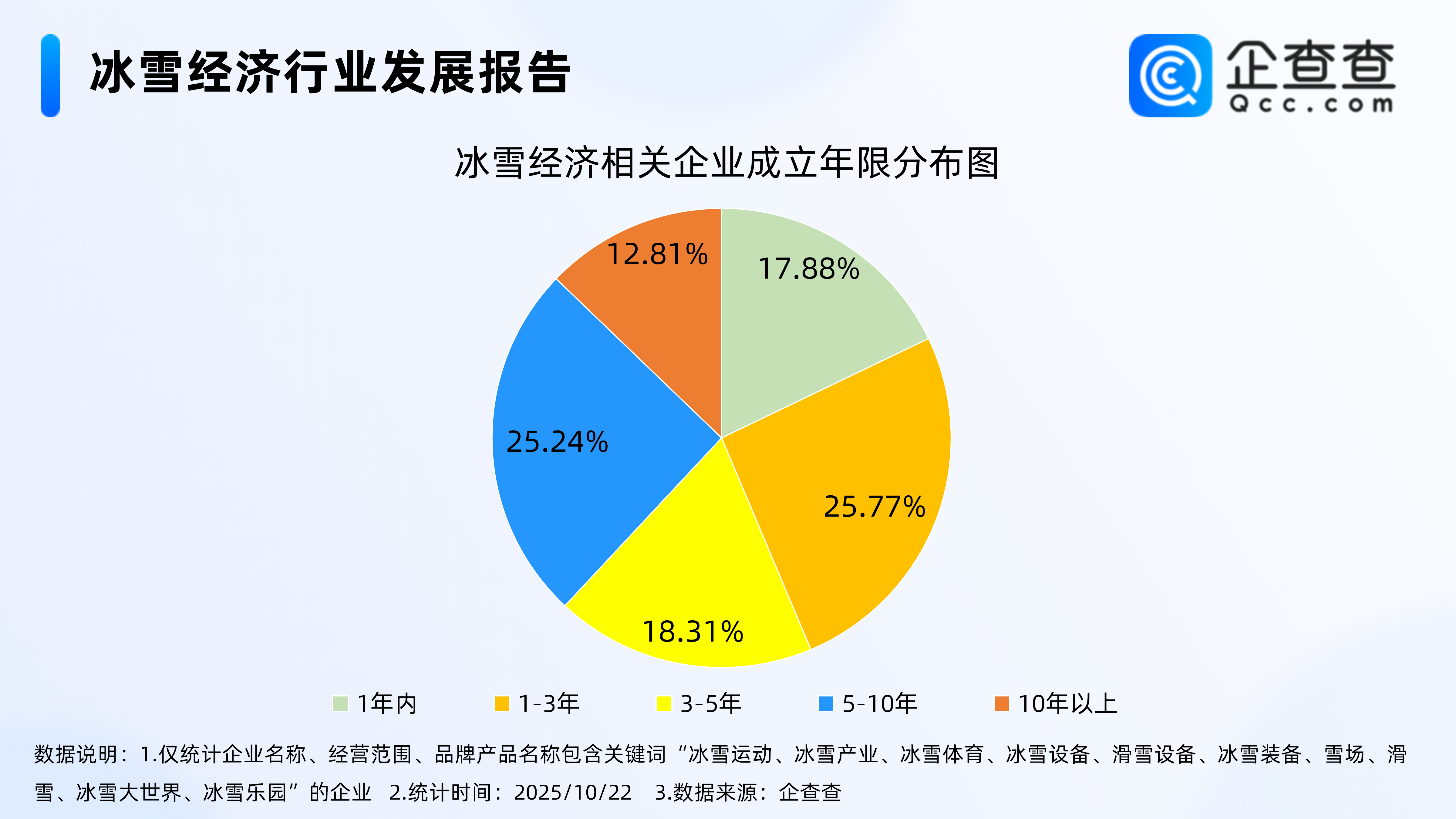 企查查数据显示,从经营时间来看,成立年限在1-3年的冰雪经济相关企业最多,占比25.77%。其次,成立年限在5-10年、3-5年的相关企业分别占比25.24%、18.31%。