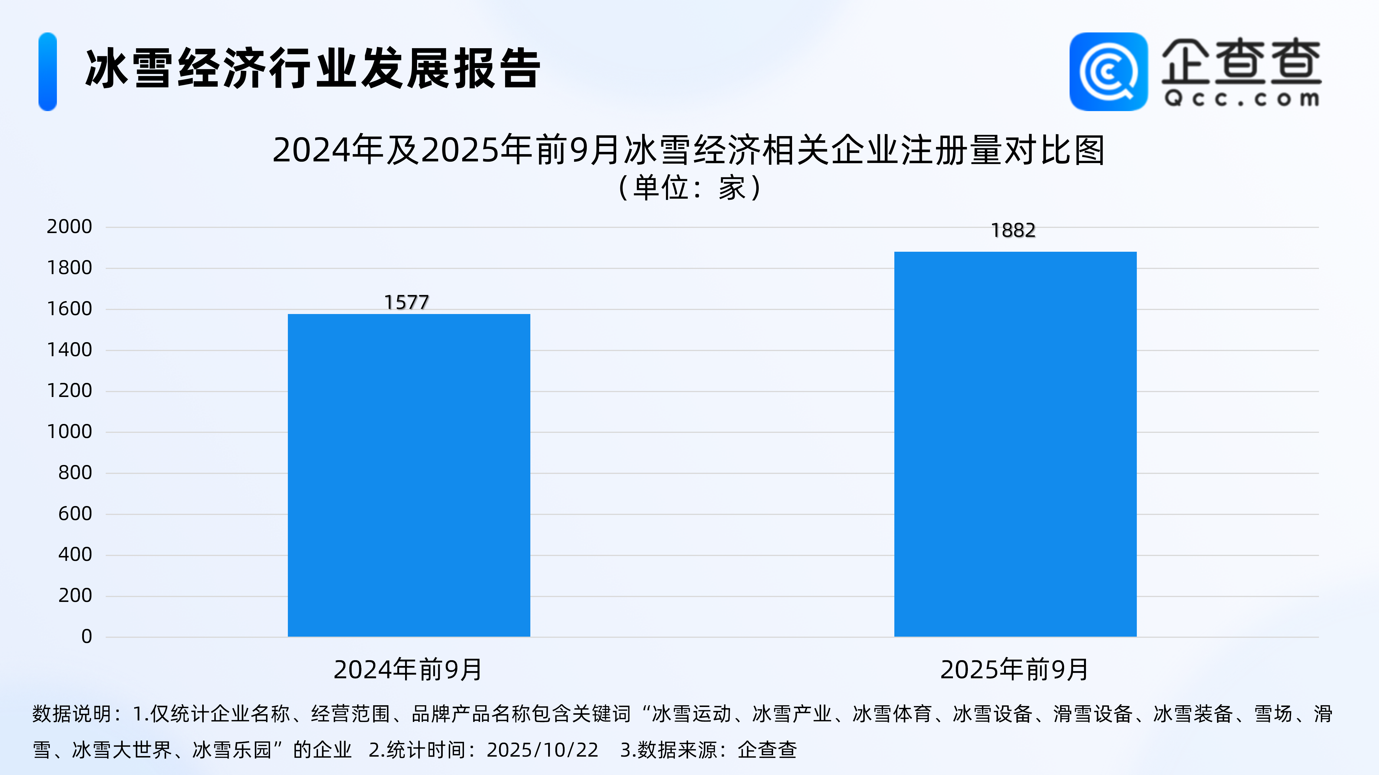 企查查数据显示,国内现存冰雪经济相关企业1.44万家。注册量方面,2023年全年注册量首次突破2000家,同比增长38.80%至2497家,达近十年注册量峰值。2024年全年注册2397家,虽较前一年有所下滑,但仍处于高位。截至目前,今年已注册1970家相关企业,其中前9月注册1882家,同比增长19.34%。