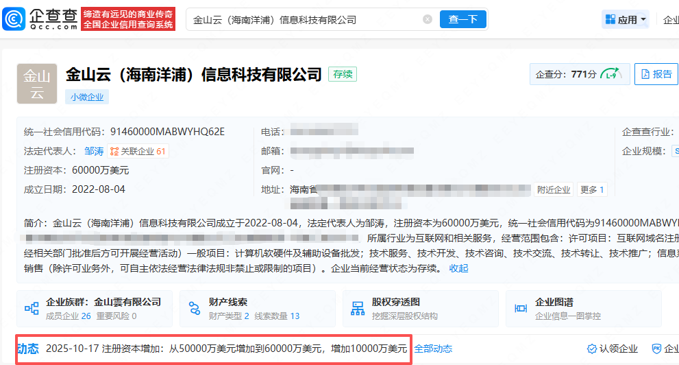 企查查APP显示,近日,金山云(海南洋浦)信息科技有限公司发生工商变更,注册资本由5亿美元增至6亿美元,增幅20%。