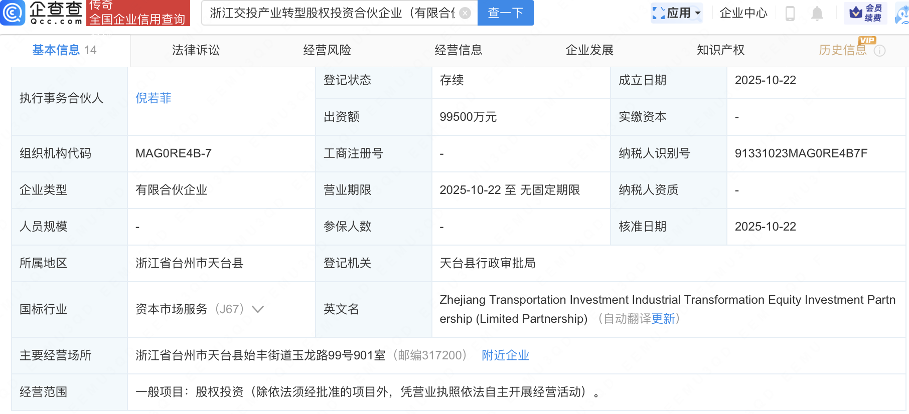 企查查APP显示,近日,浙江交投产业转型股权投资合伙企业(有限合伙)成立,出资额9.95亿元,经营范围包含:股权投资。企查查股权穿透显示,该企业由正泰集团股份有限公司旗下浙江正泰新能源投资有限公司等共同出资。