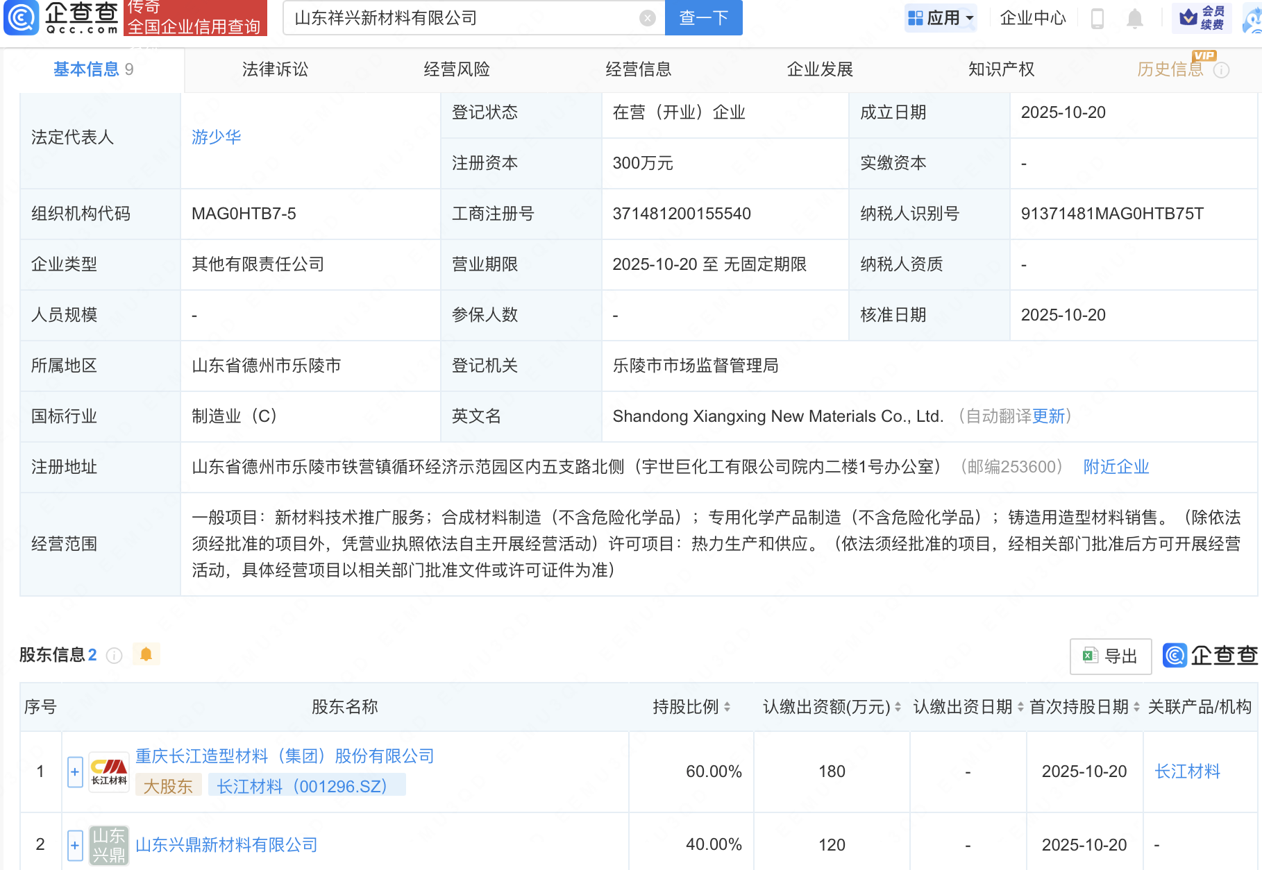 企查查APP显示,近日,山东祥兴新材料有限公司成立,法定代表人为游少华,经营范围包含:新材料技术推广服务;铸造用造型材料销售;热力生产和供应等。企查查股权穿透显示,该公司由长江材料(001296)等共同持股。