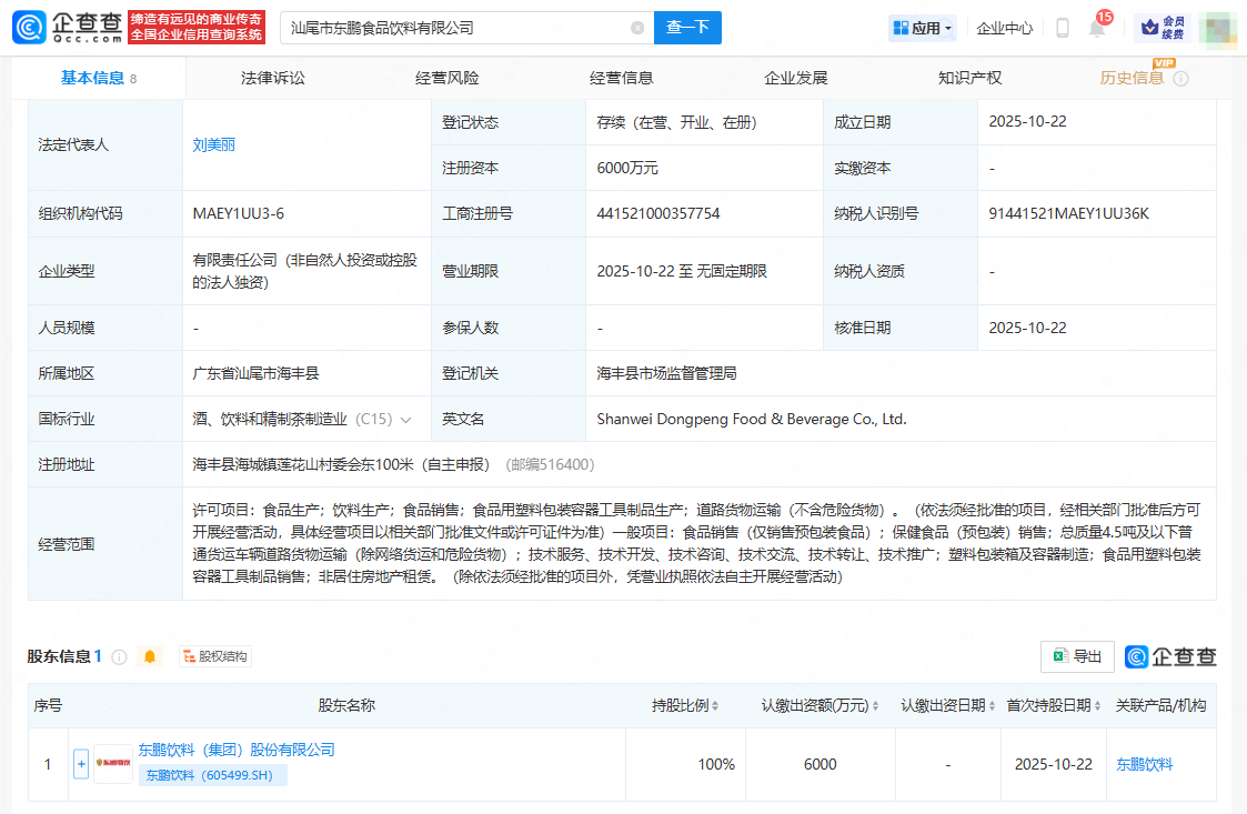 企查查APP显示,近日,汕尾市东鹏食品饮料有限公司成立,法定代表人为刘美丽,注册资本6000万人民币,经营范围含食品生产、饮料生产、食品销售、食品用塑料包装容器工具制品生产、道路货物运输、保健食品销售、非居住房地产租赁等。企查查股权穿透显示,该公司由东鹏饮料(605499)全资持股。